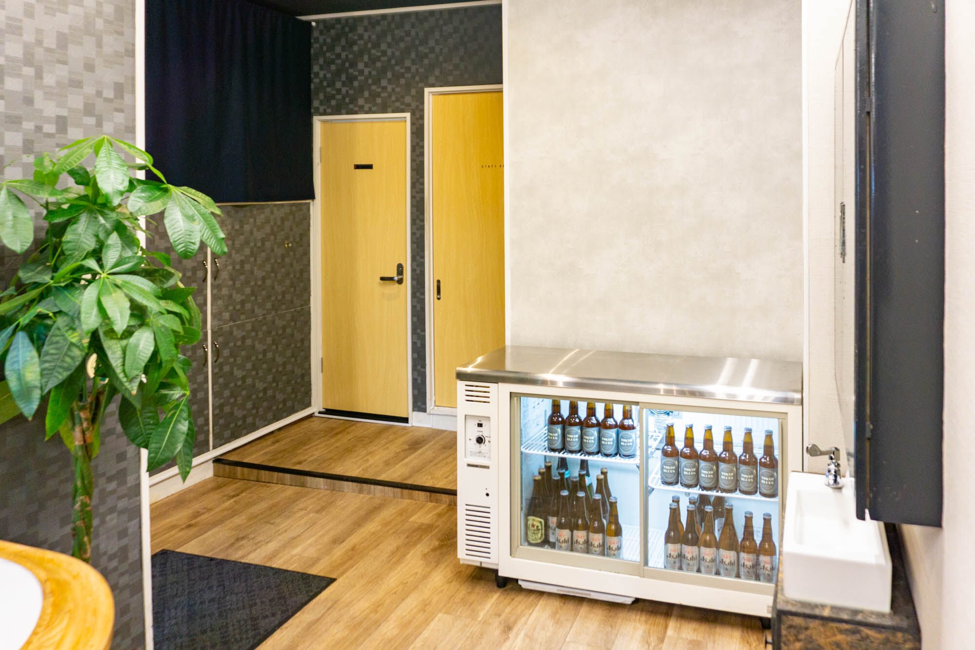 店内奥には、ビールの冷蔵庫と、お手洗いが。