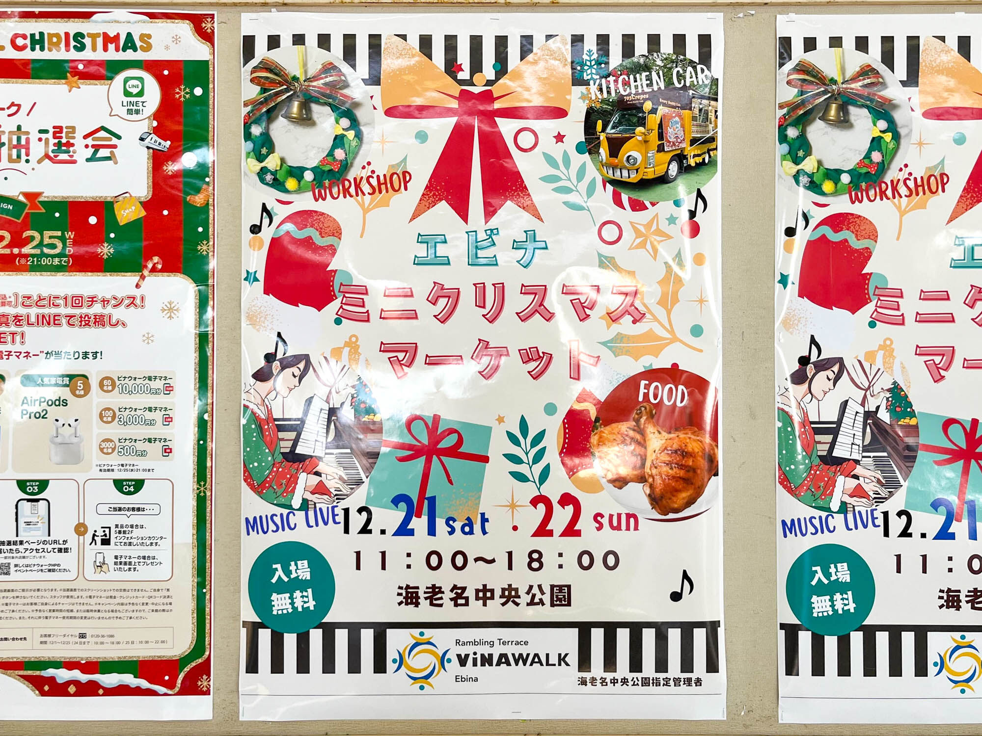上記貼紙によると、12月21・22日11:00-18:00の間、海老名中央公園で「エビナミニクリスマスマーケット」を開催するとのこと。入場無料。