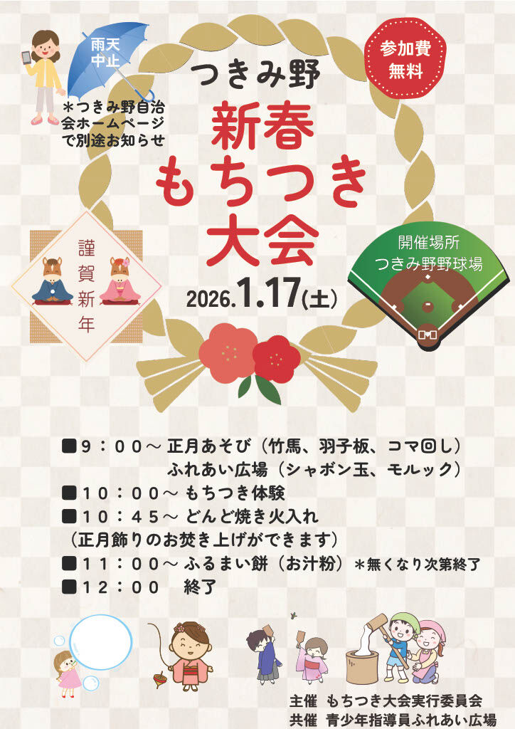 上記によると、1月17日9:00-12:00の間、つきみ野野球場で「新春もちつき大会」を開催するとのこと。雨天中止。