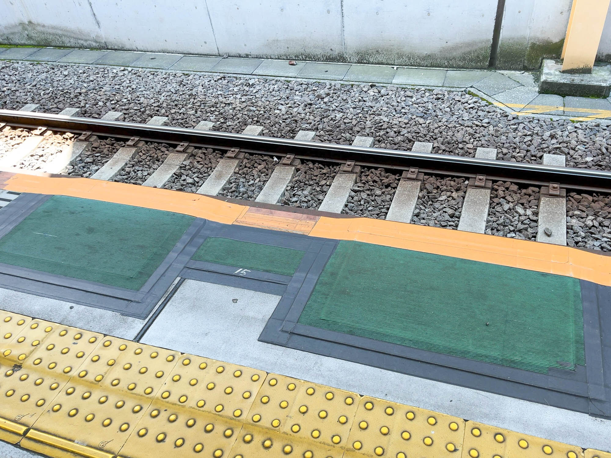 ホーム下にはホームドア設置時の目安になりそうなシートが貼ってありました。