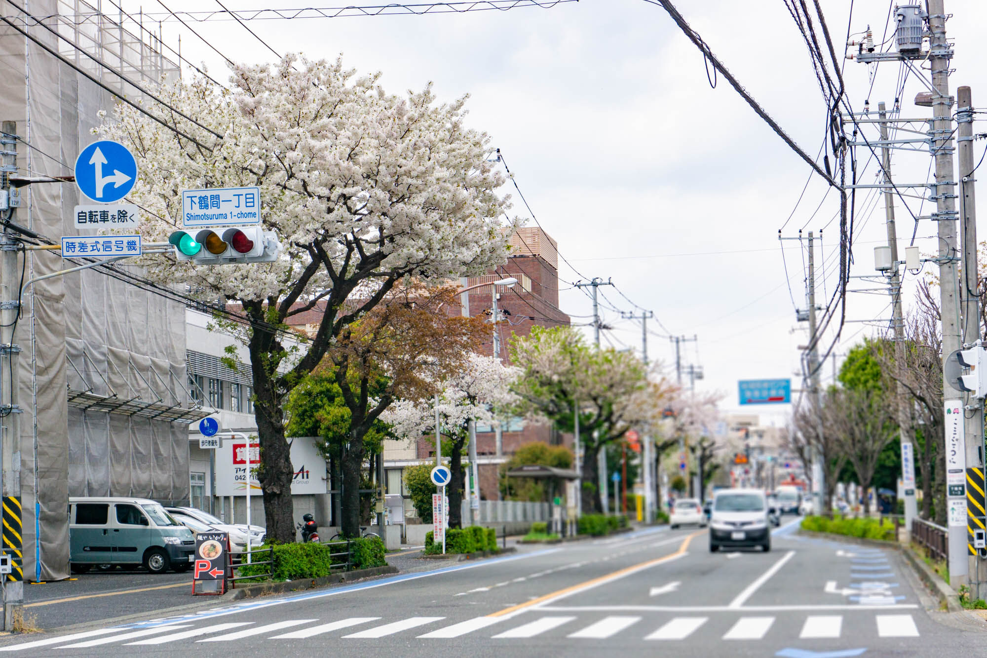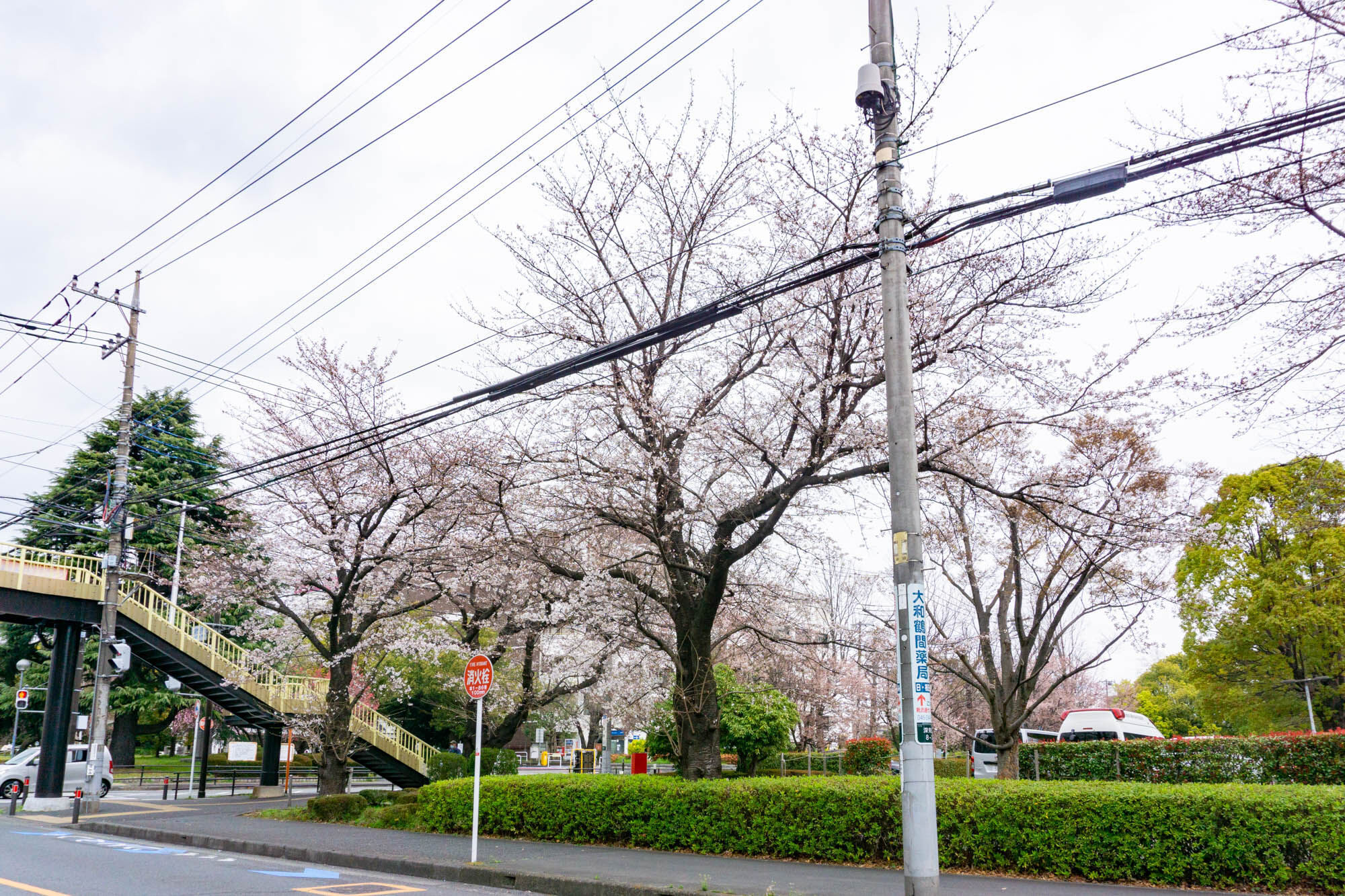 つきみ野の大和高校前の道路の様子。道沿いの両側に桜があり見応えがあります!