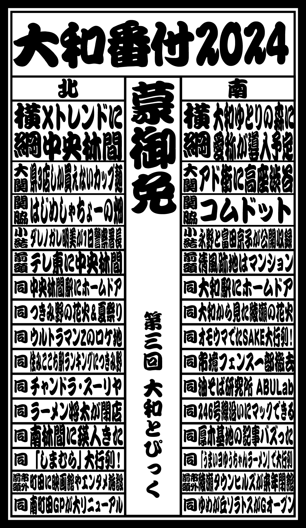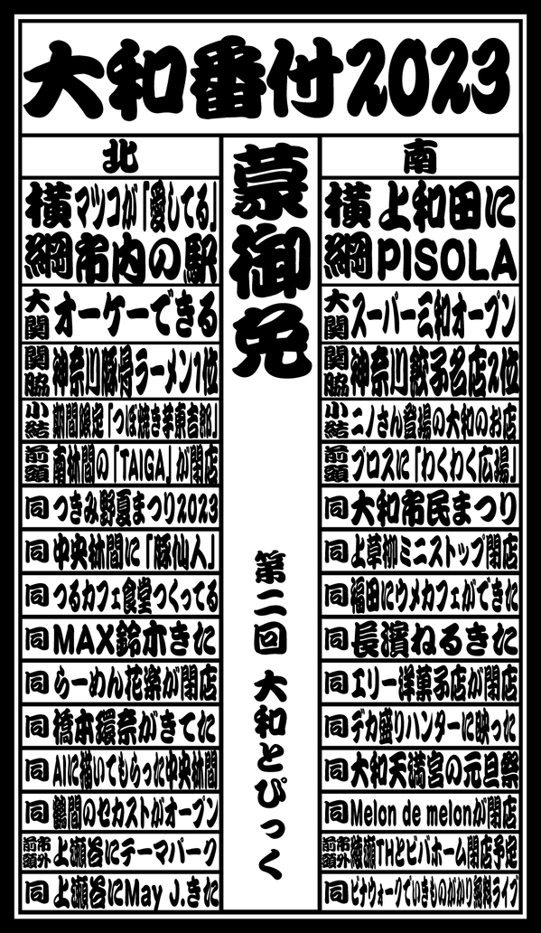 こちらは今年の開店閉店やイベント、話題のニュースなど、大和市で「こんなことあったなー」と振り返りつつ、南北対決的な意味づけで、やまとぴ編集部が独断でチョイスしたオリジナル番付。