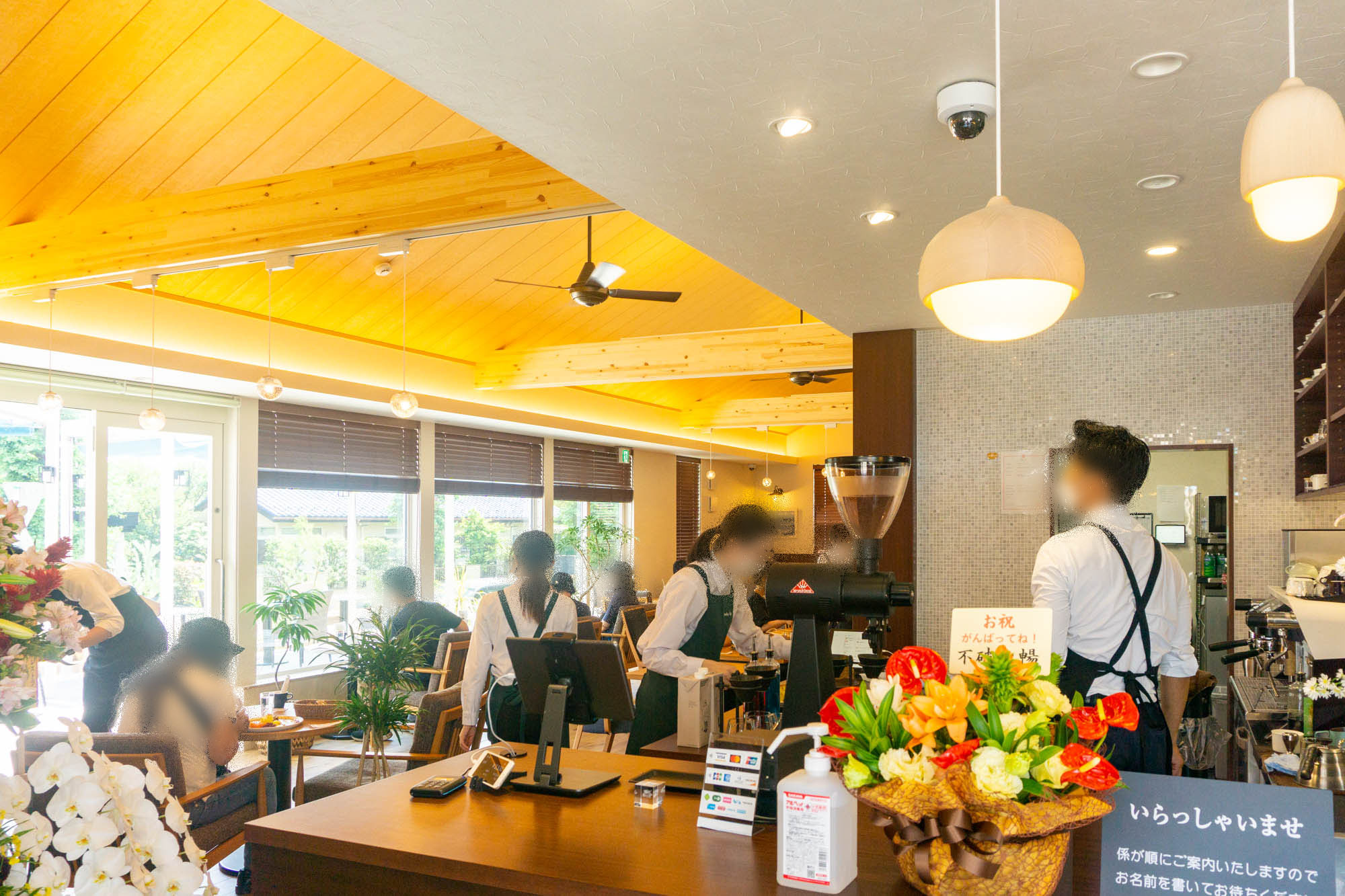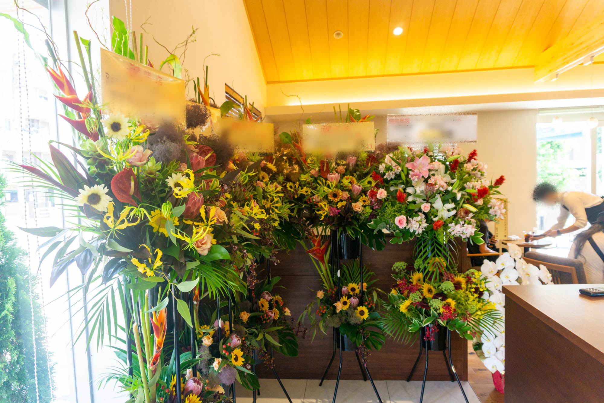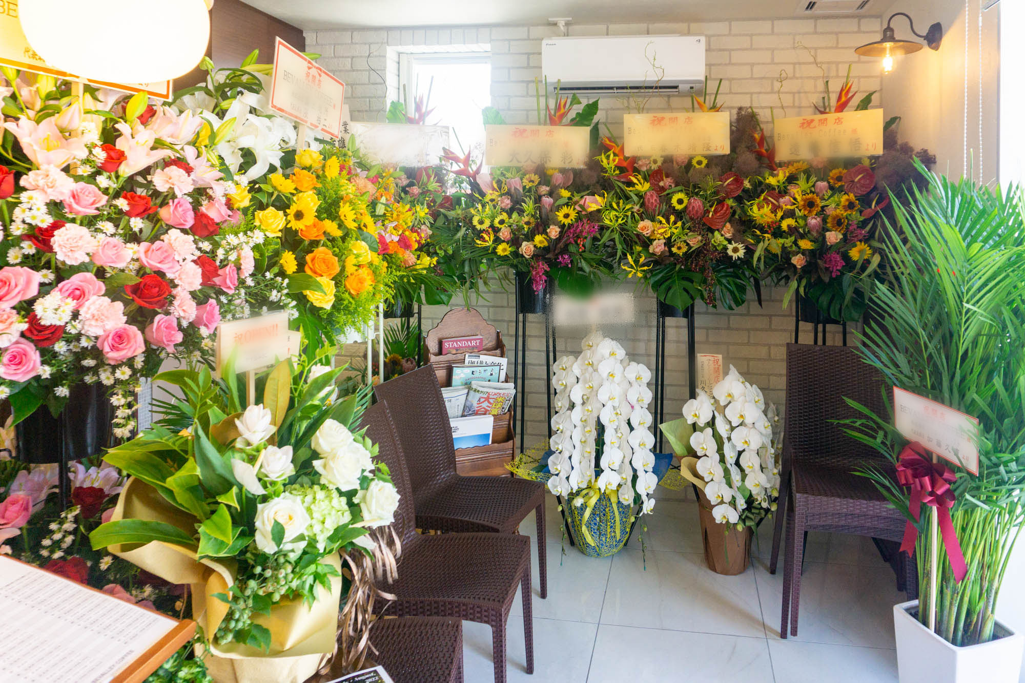 入口横にはお祝いのお花がたくさん。