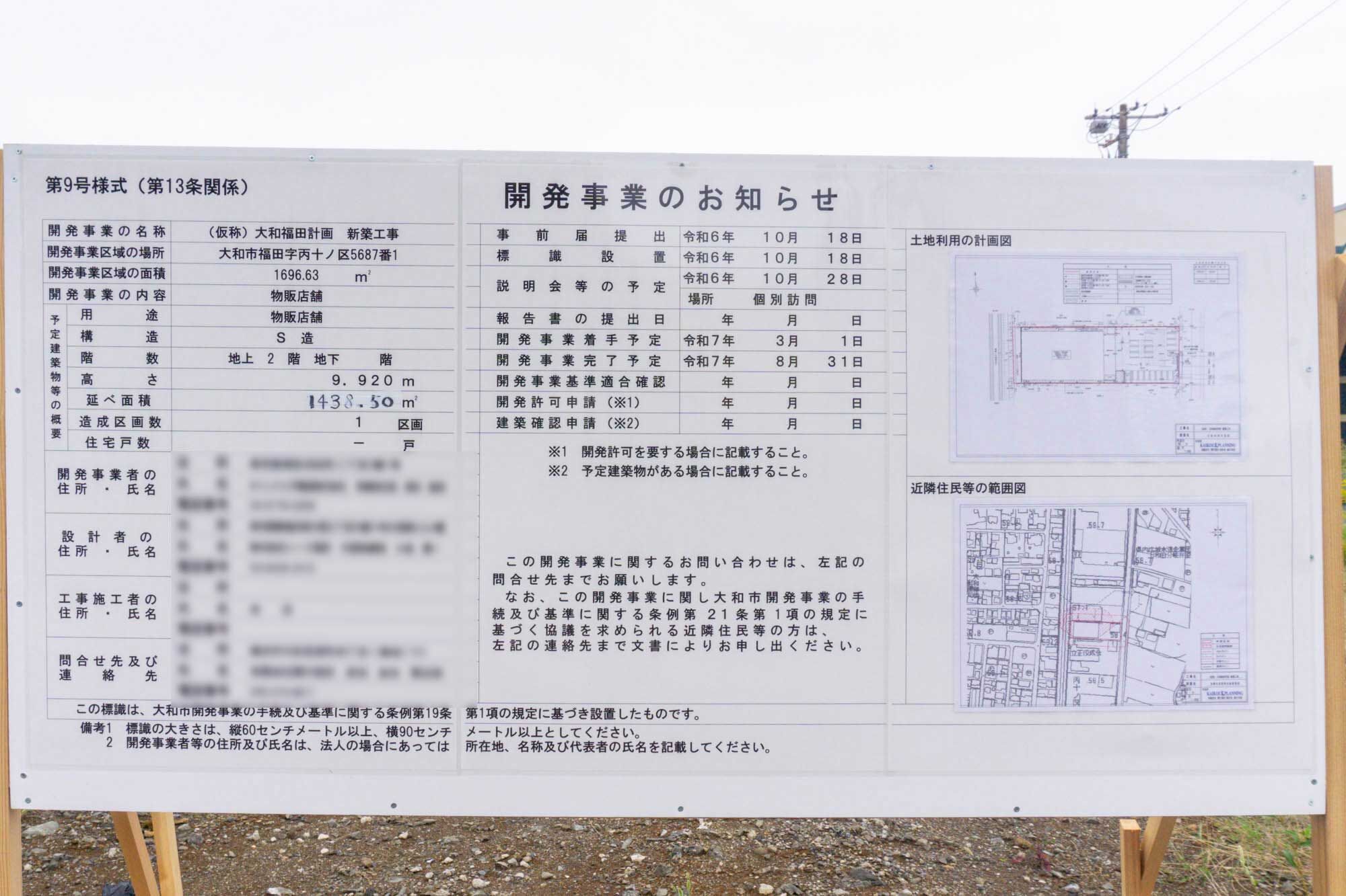 現地にあった看板によると、2階建ての物販店舗ができると記載があり、2025年8月31日に開発事業完了予定とのこと。