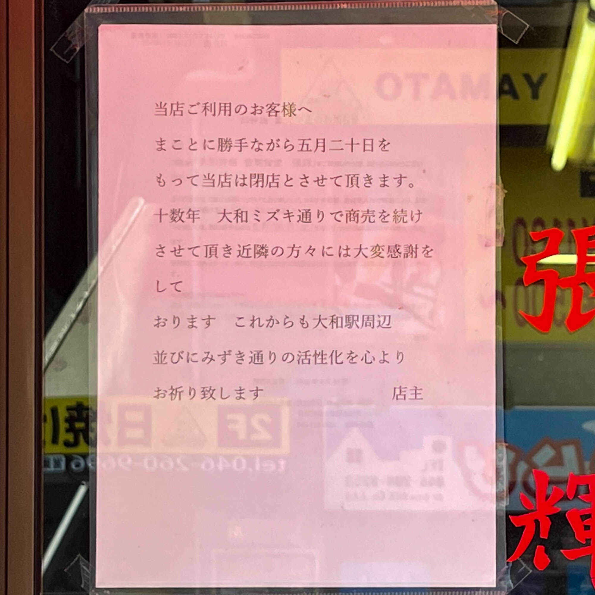 店舗前の貼紙によると、5月20日で閉店するとのこと。感謝の言葉も記載されていました。