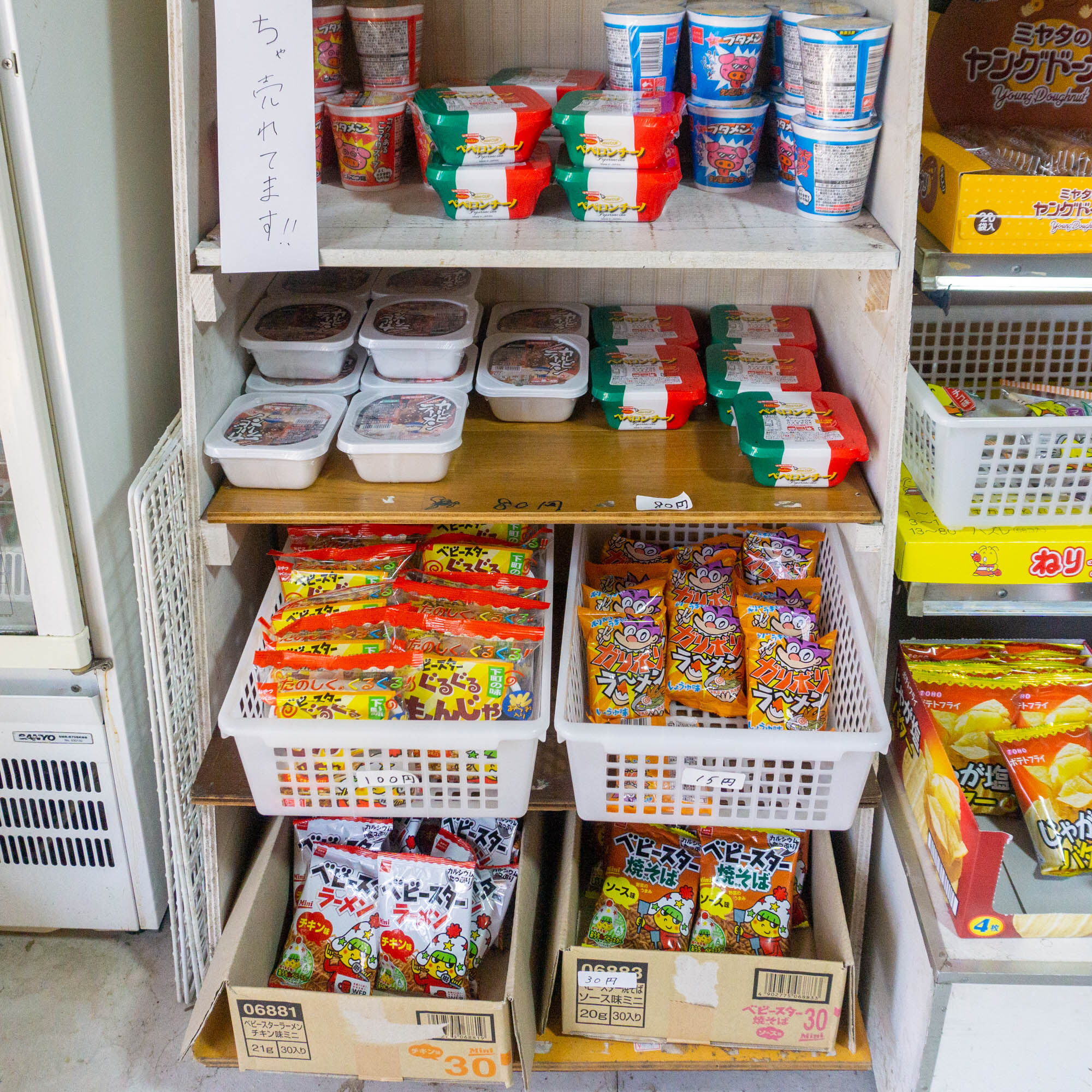 カップ麺やベビースターなど。「ぐるぐるもんじゃ」も!!