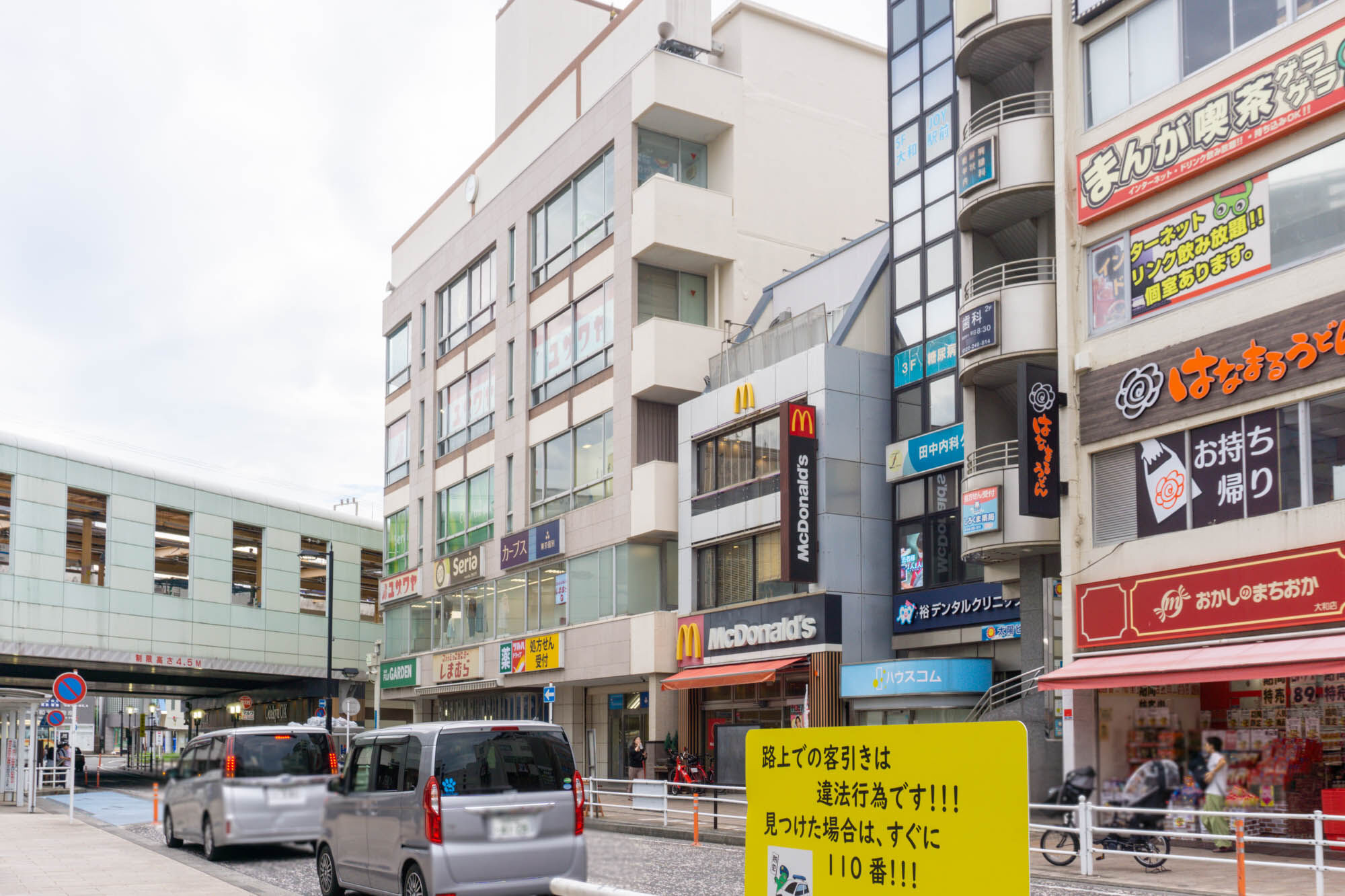 写真右手に店舗があり、左手には大和駅が。