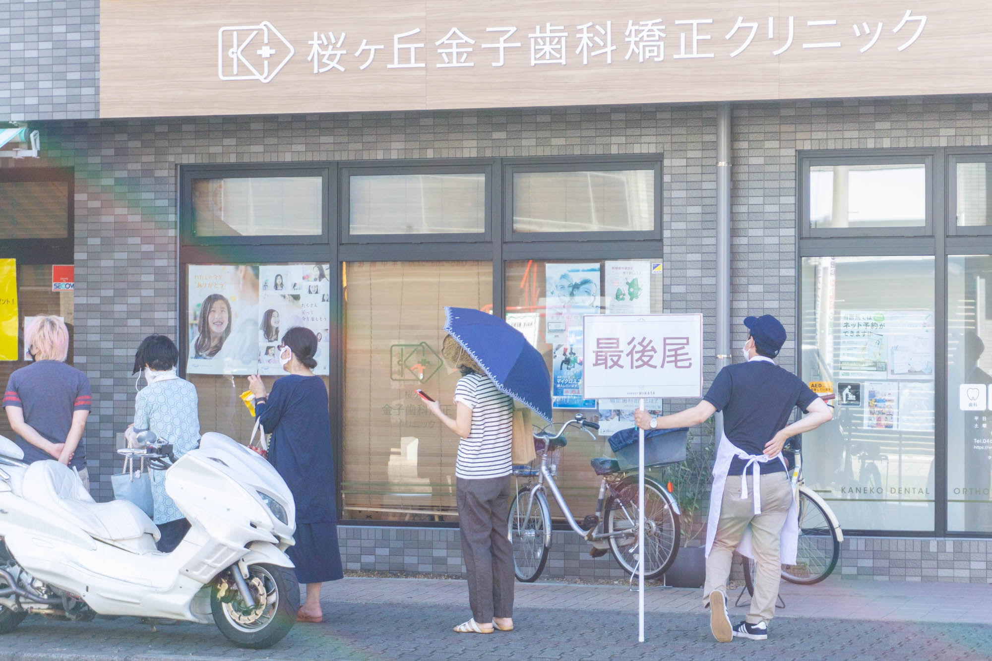 最後尾はなんと、隣の「桜ヶ丘金子歯科矯正クリニック」の入口付近!!