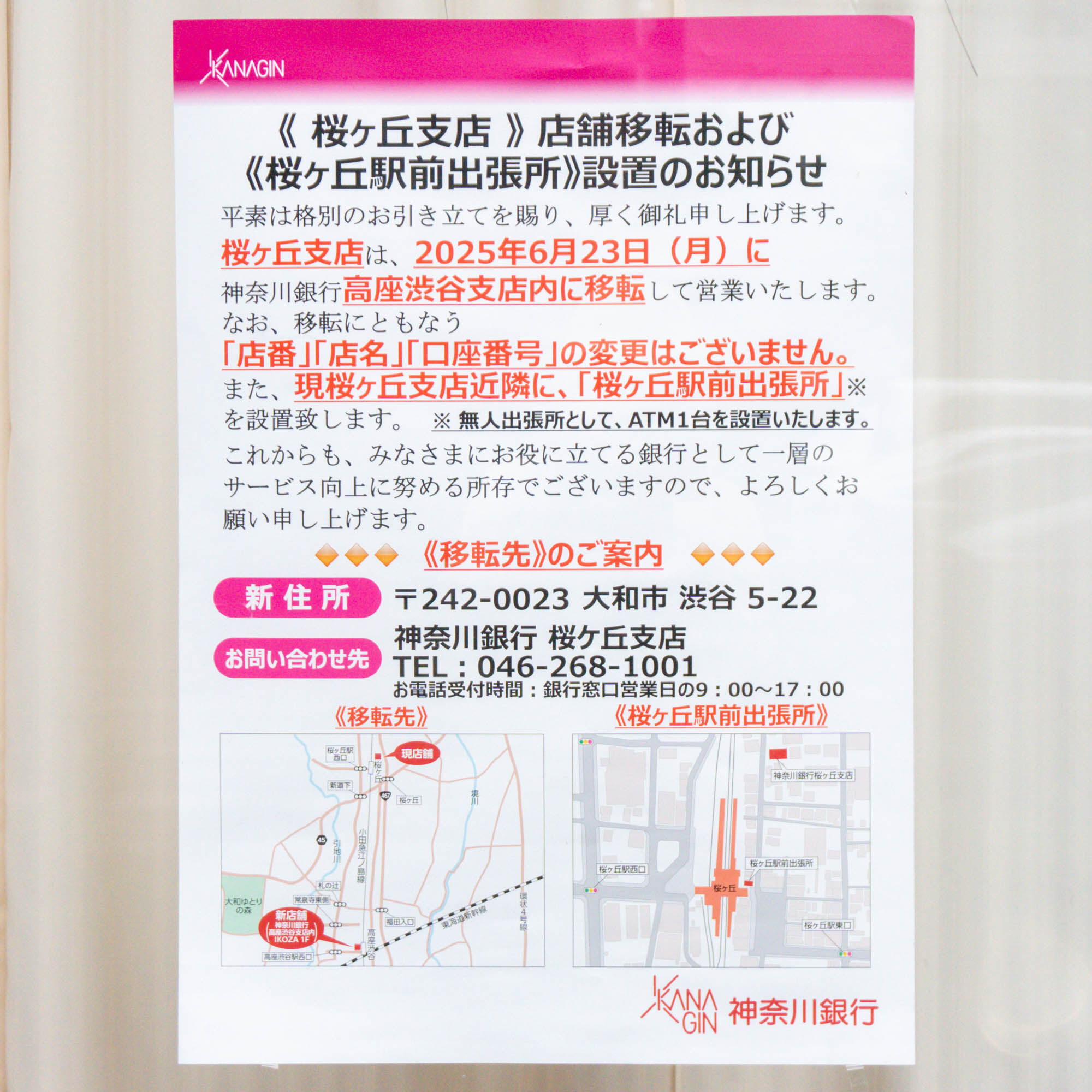 店舗の貼紙によると、「神奈川銀行 桜ヶ丘支店」は6月23日で店舗移転するとのこと。移転先は「高座渋谷支店」内で、桜ヶ丘支店の近隣には無人出張所が設置されるみたい。