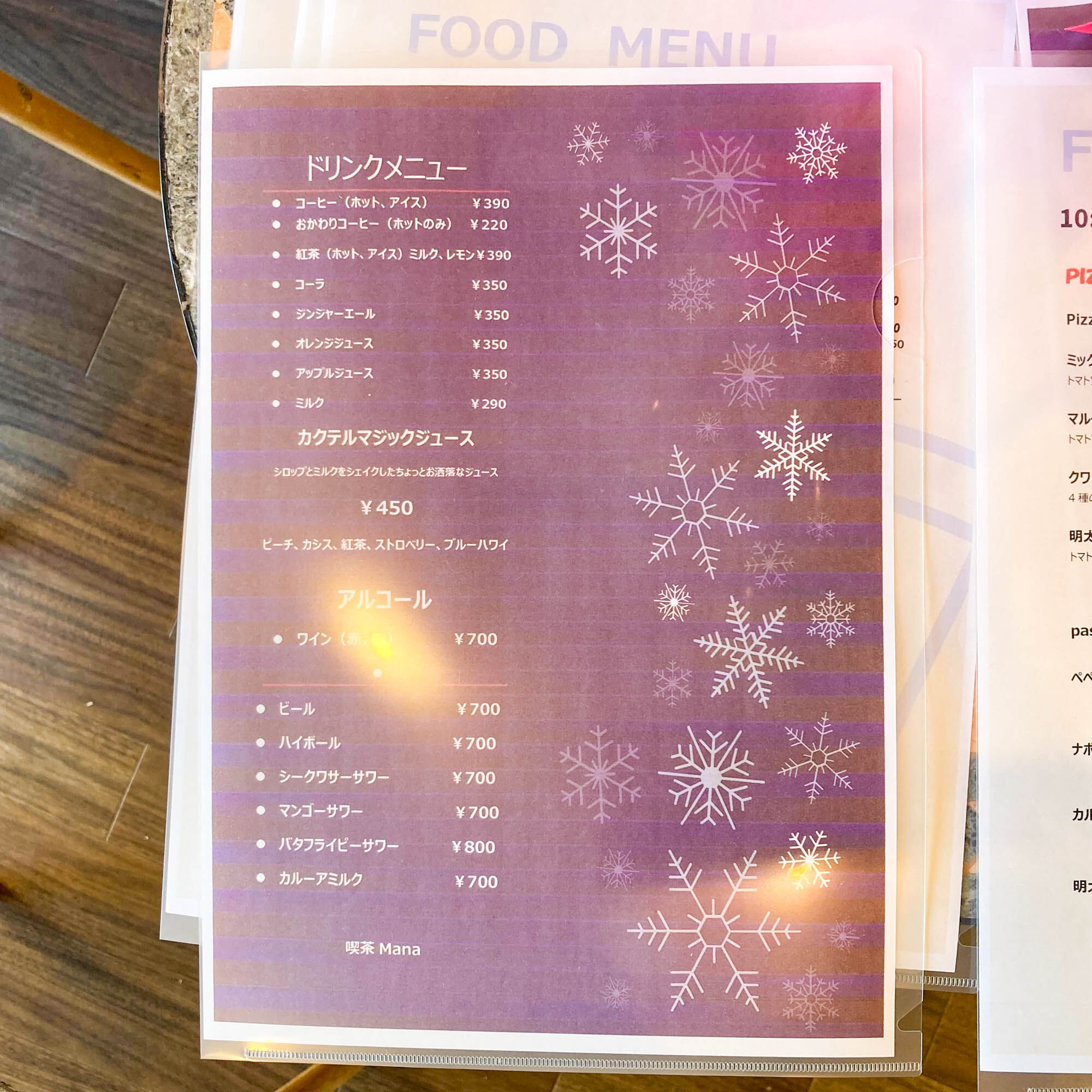 ドリンクメニュー。ソフトドリンクのほか、アルコールも置いてありました。