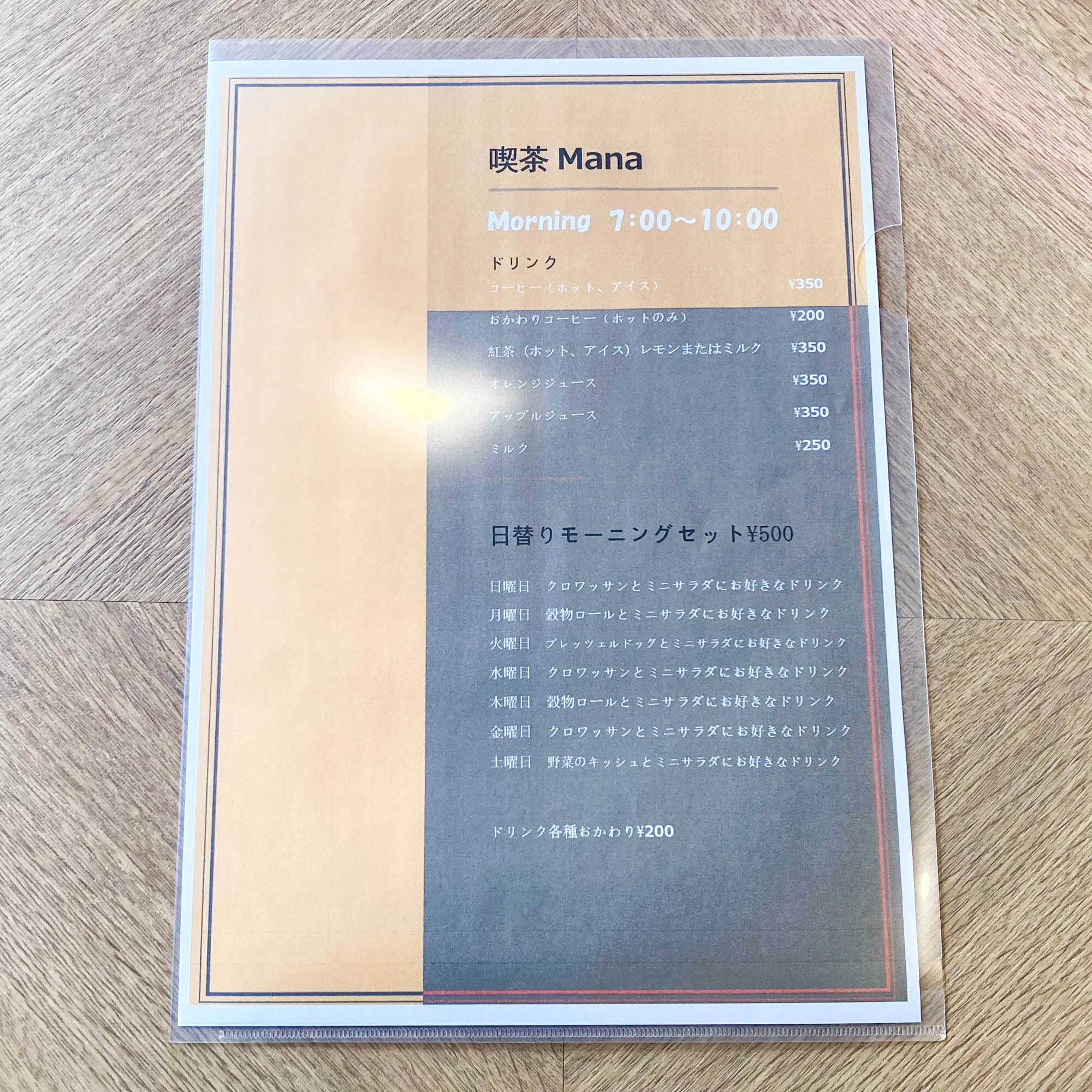 こちらはモーニングメニュー。モーニングセットは日替わりでパンの種類が変わるとのこと。注文できるのは7時〜10時まで。
