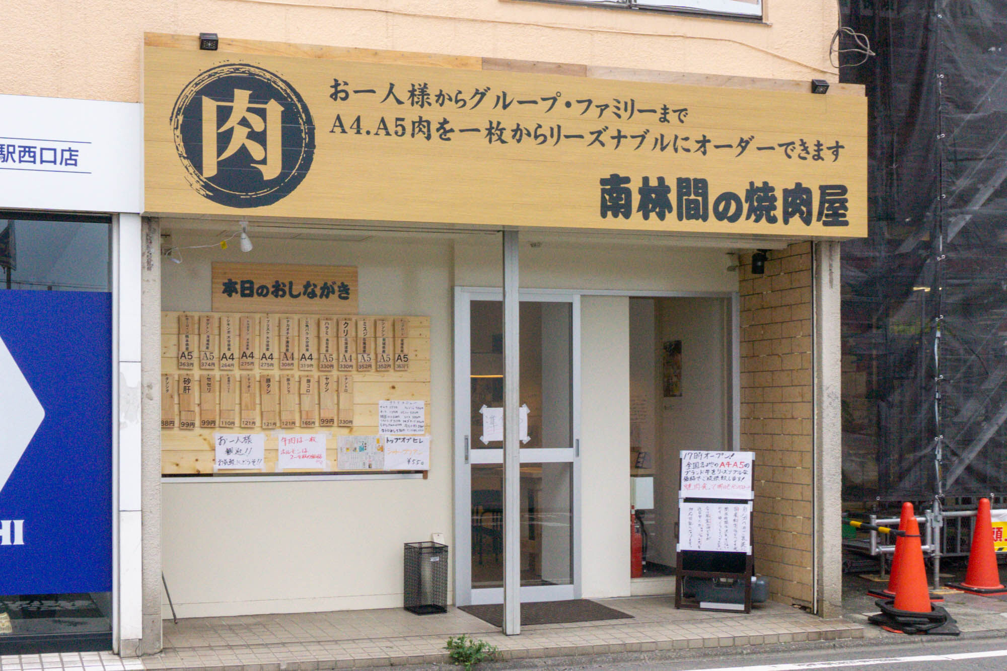 「南林間の焼肉屋」はA4、A5の国産和牛を1枚から注文できる焼肉店。公式SNSや系列店は見つかりませんでした。