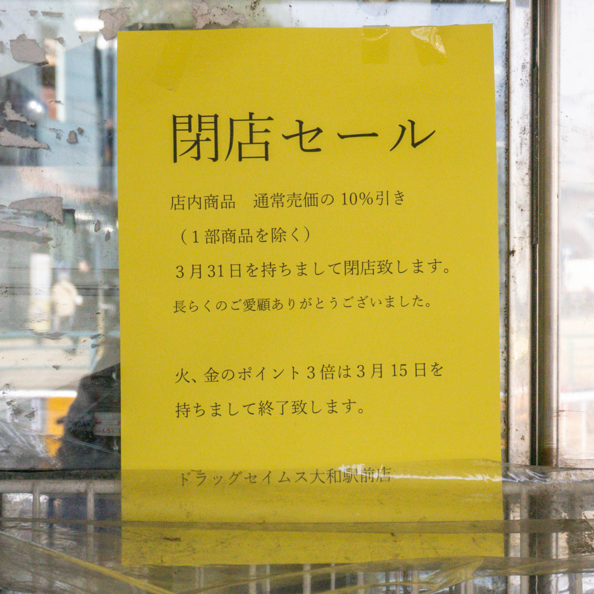 大和駅近くのドラッグストア「セイムス 大和駅前店」が閉店するようです。