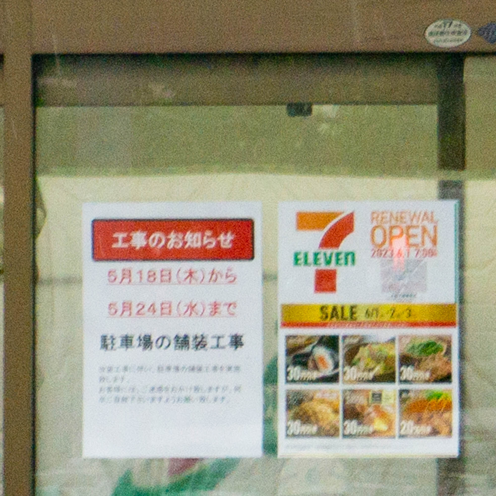 画質が悪いですが、店舗入口には駐車場の舗装工事のお知らせと、6月1日7:00にリニューアルオープンとの貼紙がありました。