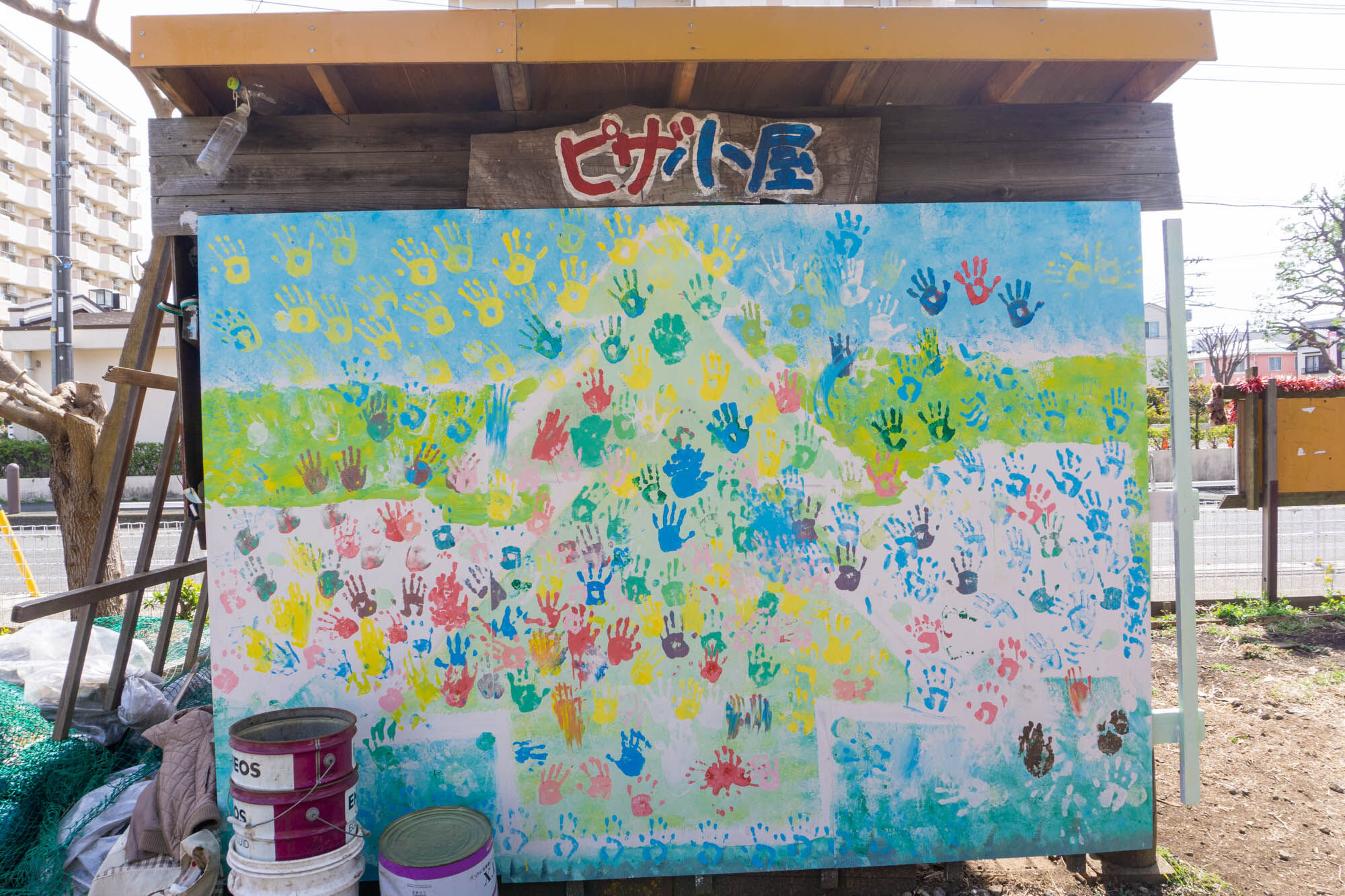 遊びにきた子がツリーガーデンを手形で飾っています。