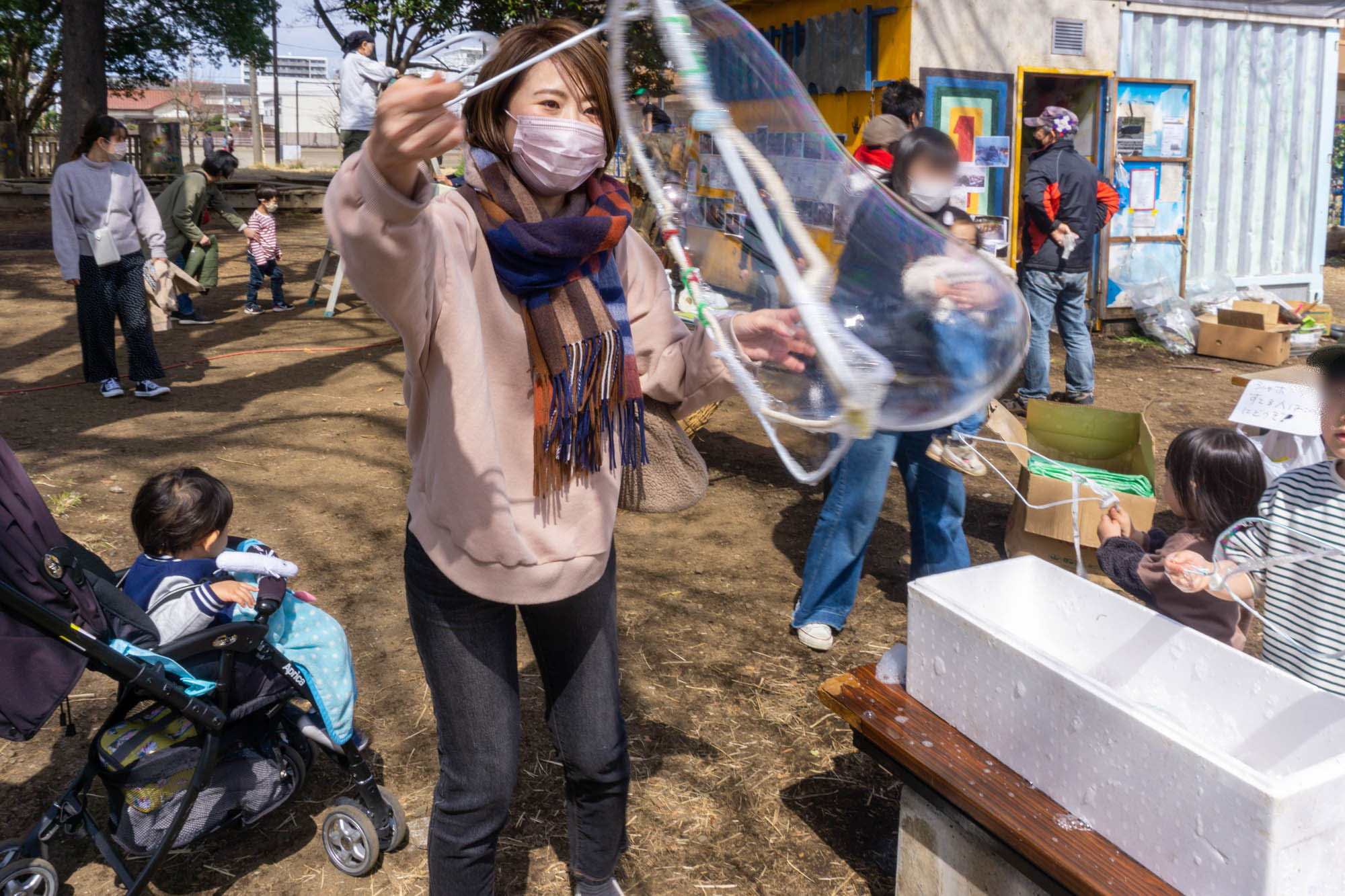 最終日をシャボン玉でお見送りしようということで、入り口すぐのところにみんなで遊べるシャボン玉台もありました。