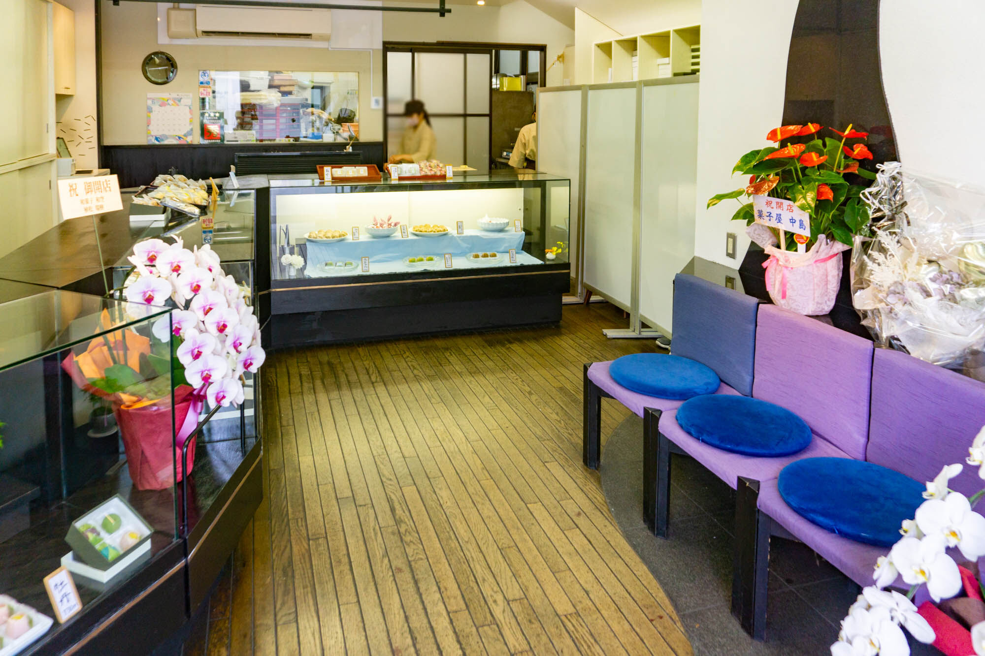 入口付近にお祝いのお花が並び、店内はショーケースが3つ。