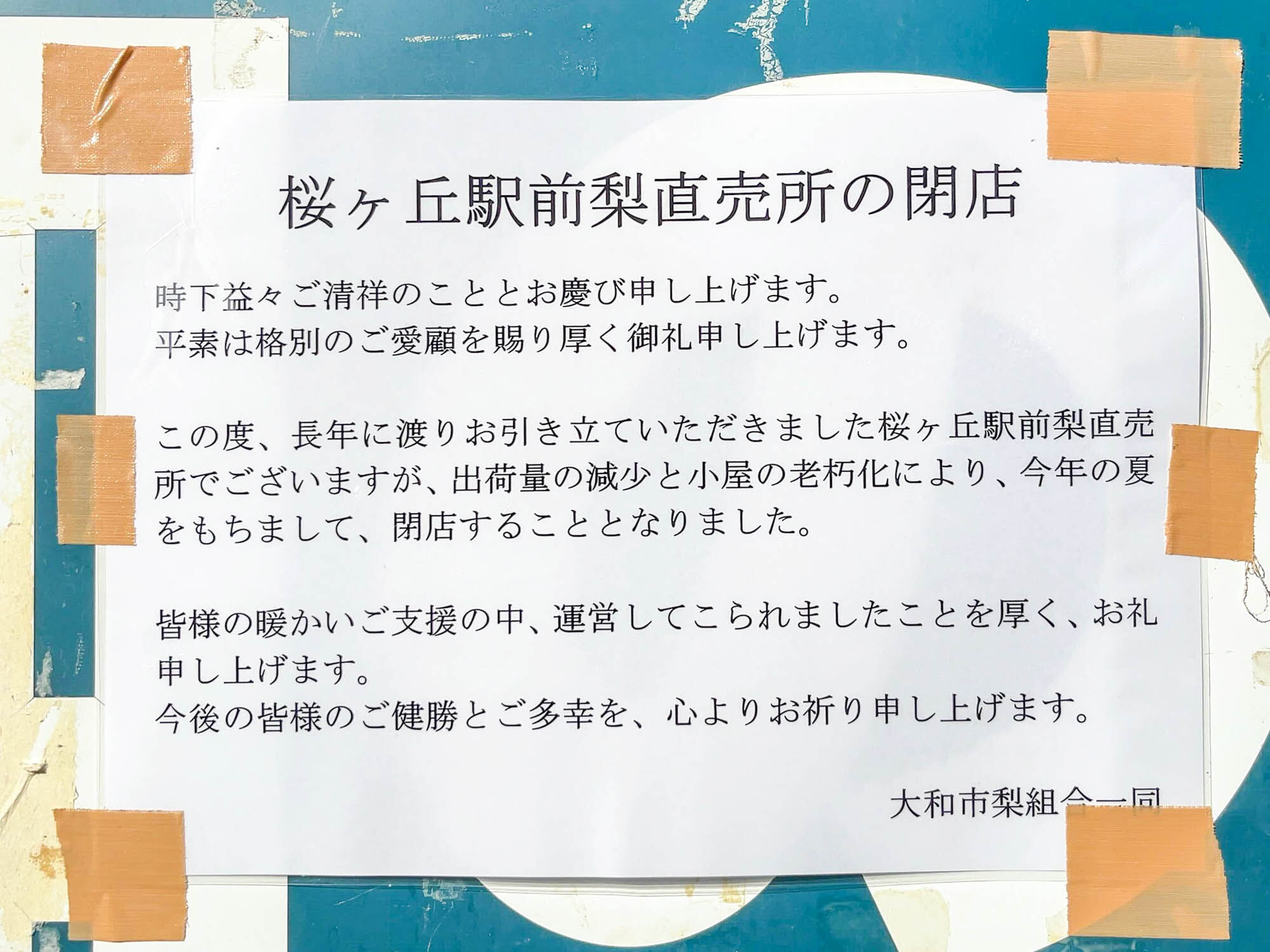 桜ヶ丘駅近くの直売所「大和の梨」が閉店しています。
