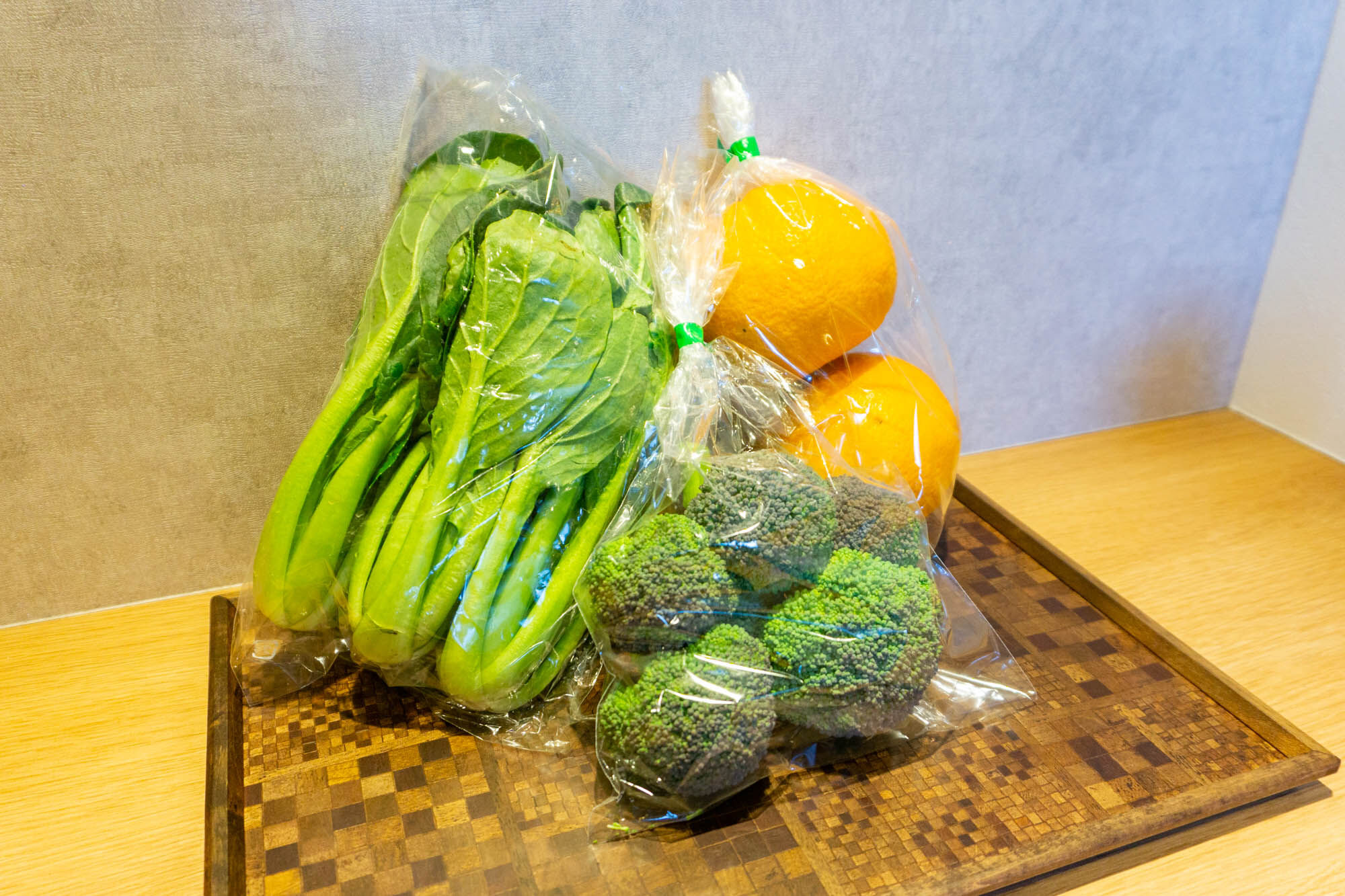 今回「小松菜・ブロッコリー・夏みかん」(各100円)を購入。生き生きしてますね!さすが地元産の新鮮野菜。