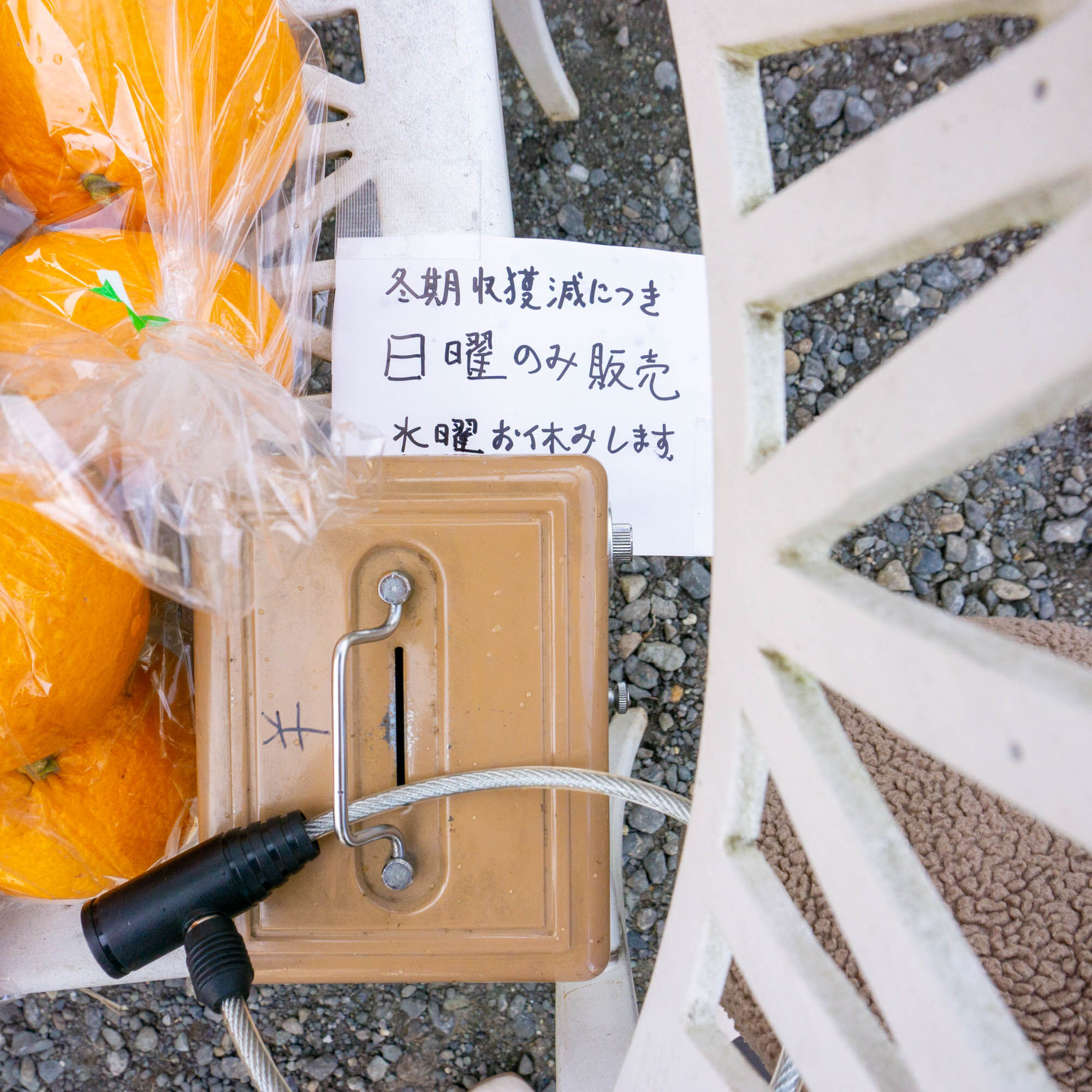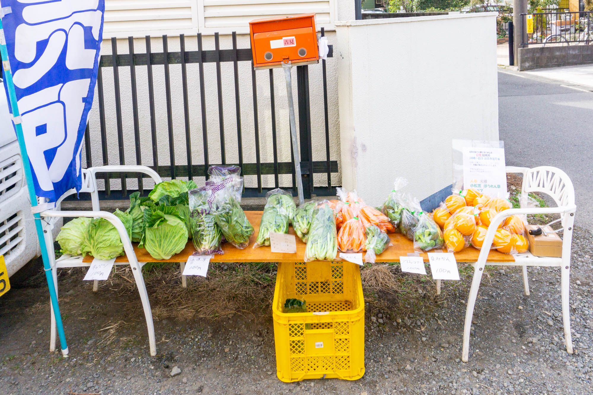 基本的には無人販売のため、支払いはこちらのボックスに入れる形。買い物の際には小銭をお忘れなく!
