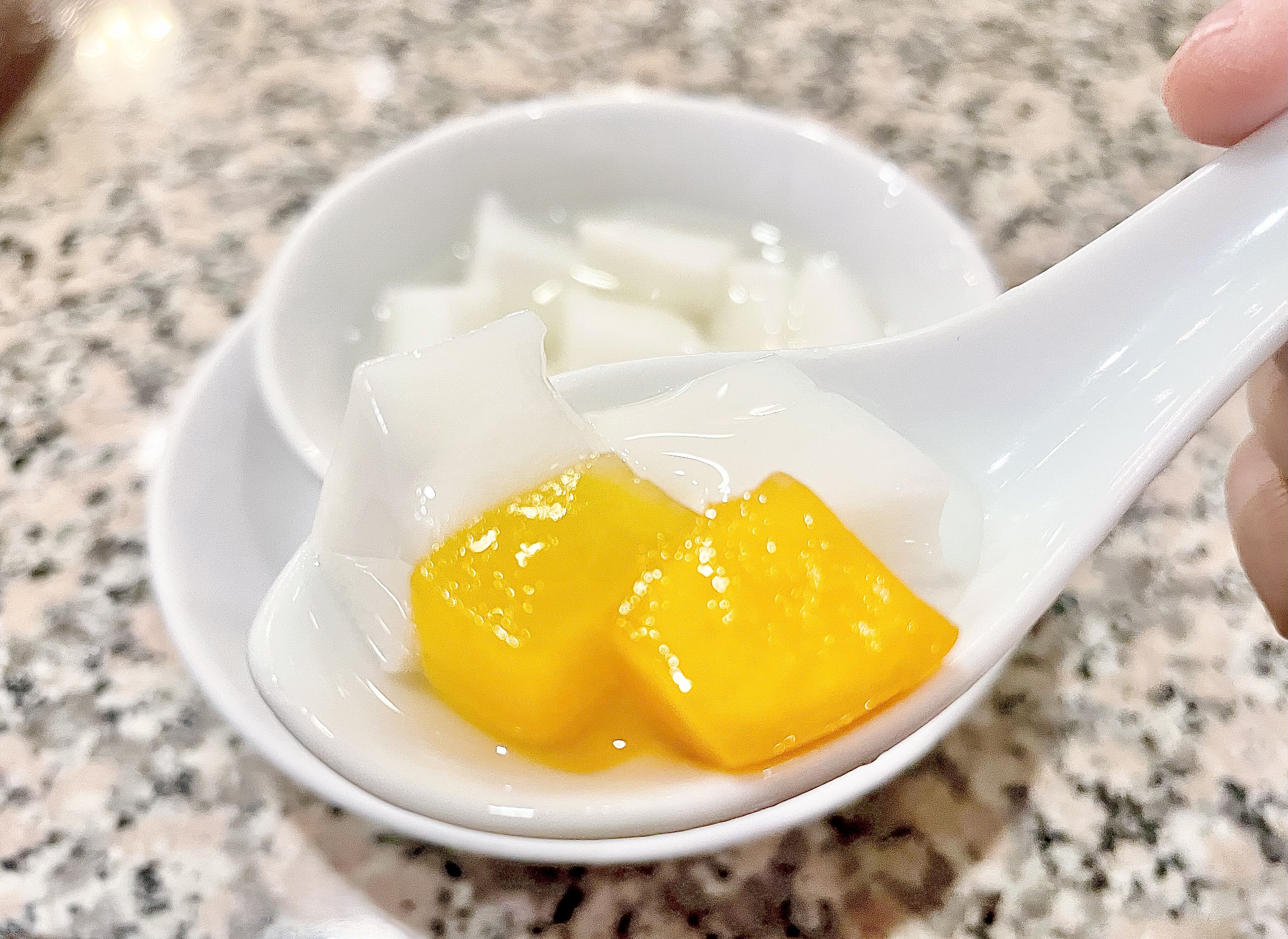 デザートの杏仁豆腐には黄桃が入っていました。