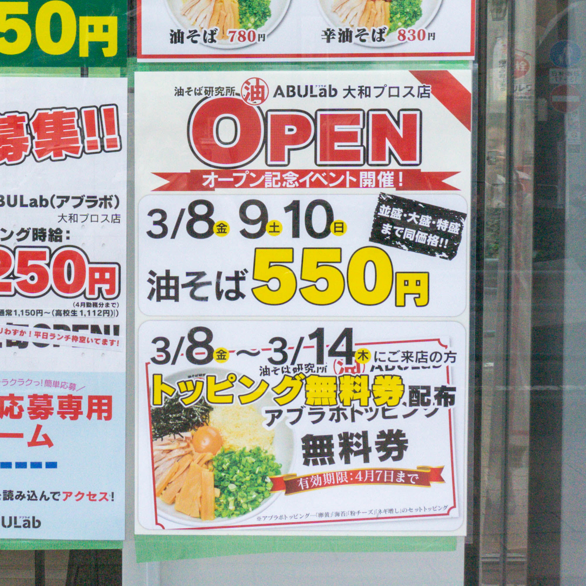 上記のポスターには、オープン記念イベントで3/8-3/10の間「油そば 並盛・大盛・特盛」を550円で提供するとの情報が。オープン記念イベントを見て来た人も多いのかも。