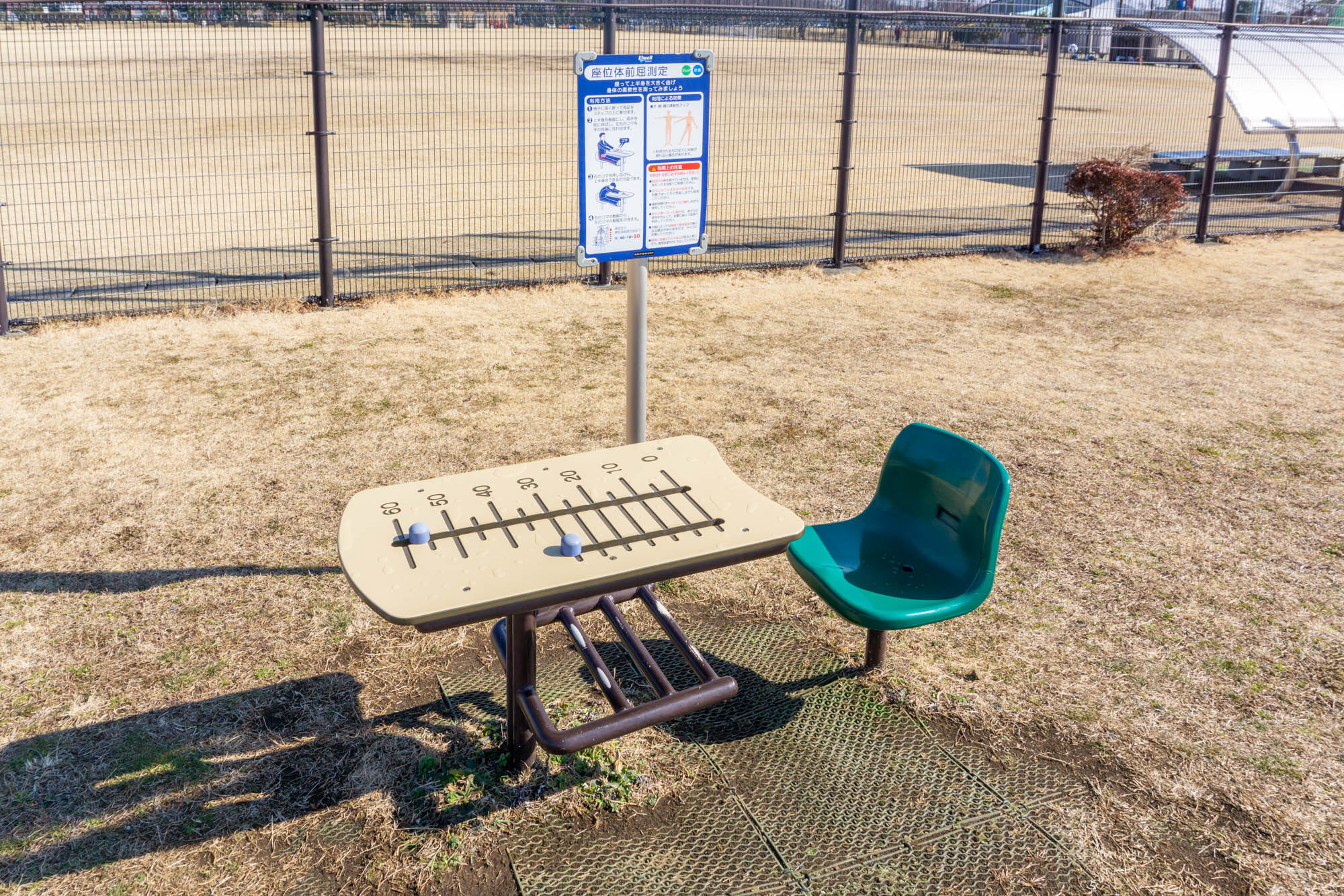 実はこちらゆとりの森の中にある「健康遊具」の1つで『座位体前屈測定』というお名前。