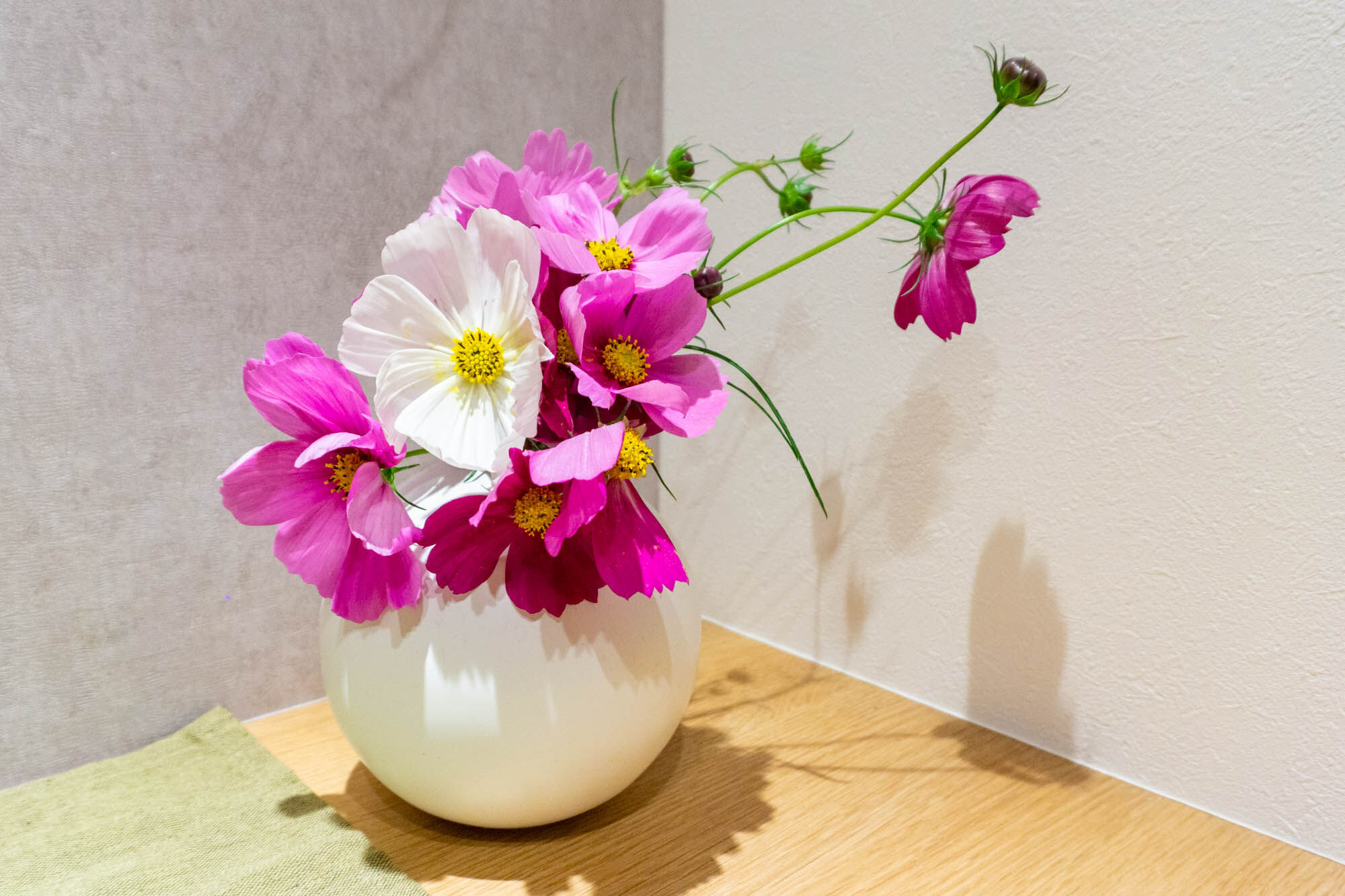 日中は保育園の子どもたちも来るようで、我が家にも息子が摘んできてくれたコスモスが現在咲き誇っています。