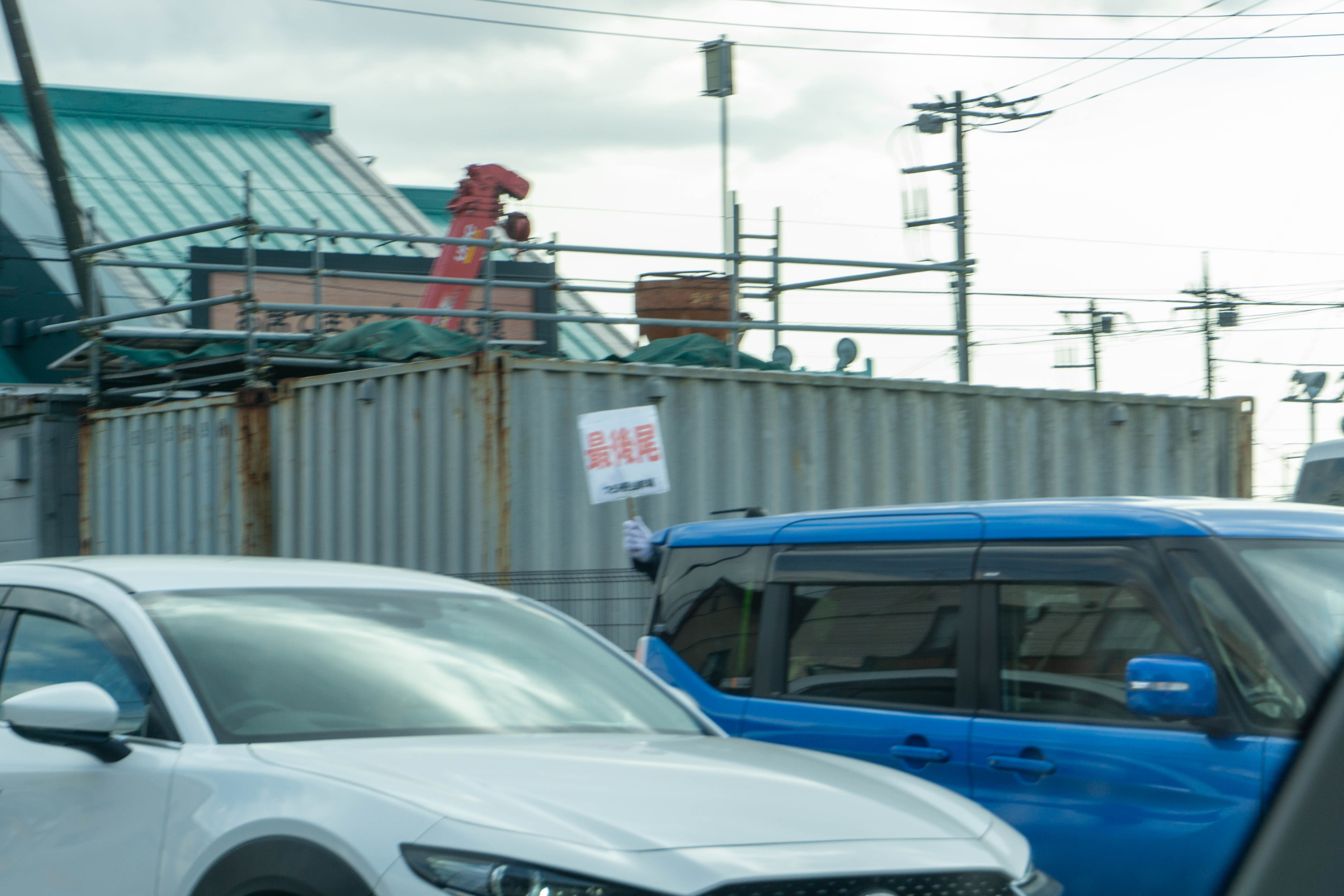 (そのお店での駐車場最後尾を案内する手と看板)