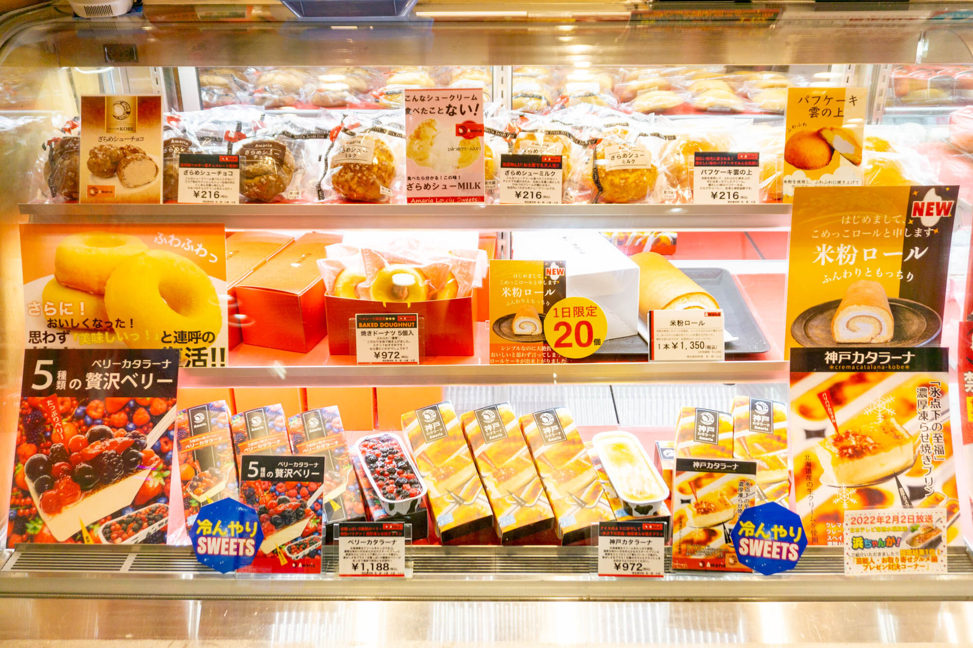 ショーケースには神戸カタラーナやシュークリーム、米粉ロールなど種類がたくさん!