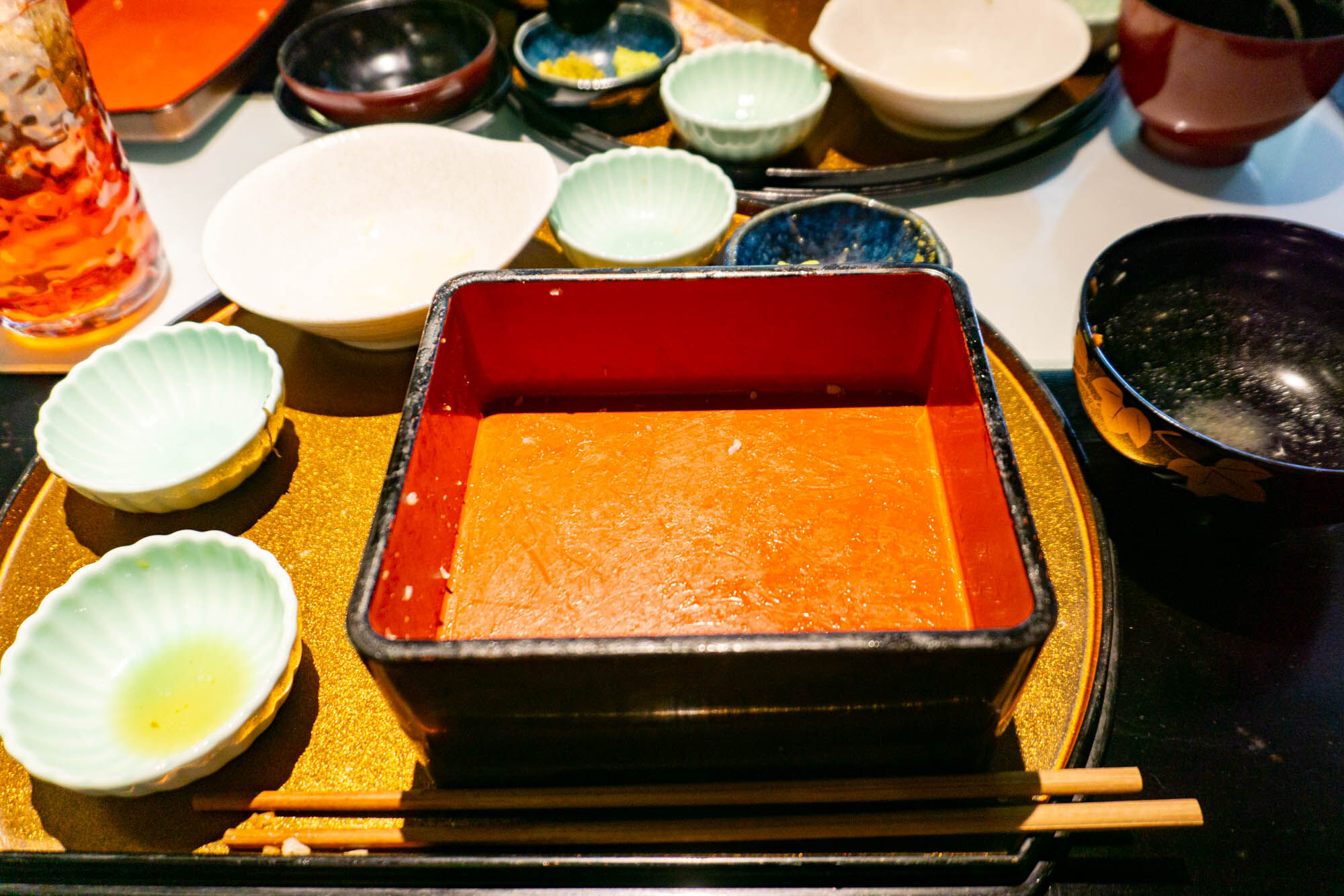 だいたいこのお肉が全てなくなったあたりで山盛り部分のご飯がなくなり、後にはお重ぱんぱんのご飯と小鉢たちが残されました。