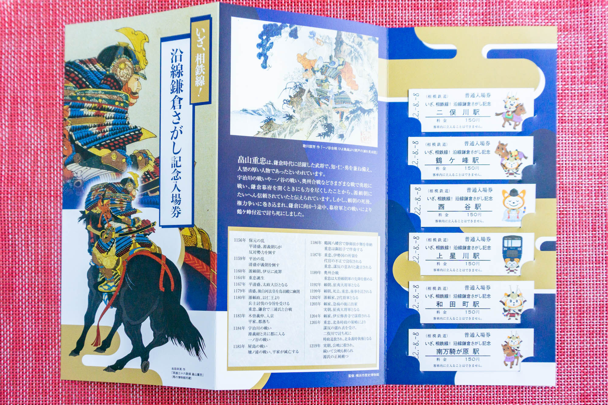 入場券セットの台紙には、畠山重忠の紹介や鎌倉時代を中心とした年表を記載。さらに裏面には、相鉄線沿線の鎌倉時代にゆかりのある史跡13ヶ所を示した地図も掲載されていました。