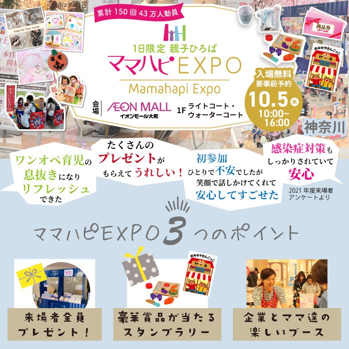 累計150回43万人動員した「ママハピ@EXPO」がイオンモール大和で開催されるみたい。10月5日