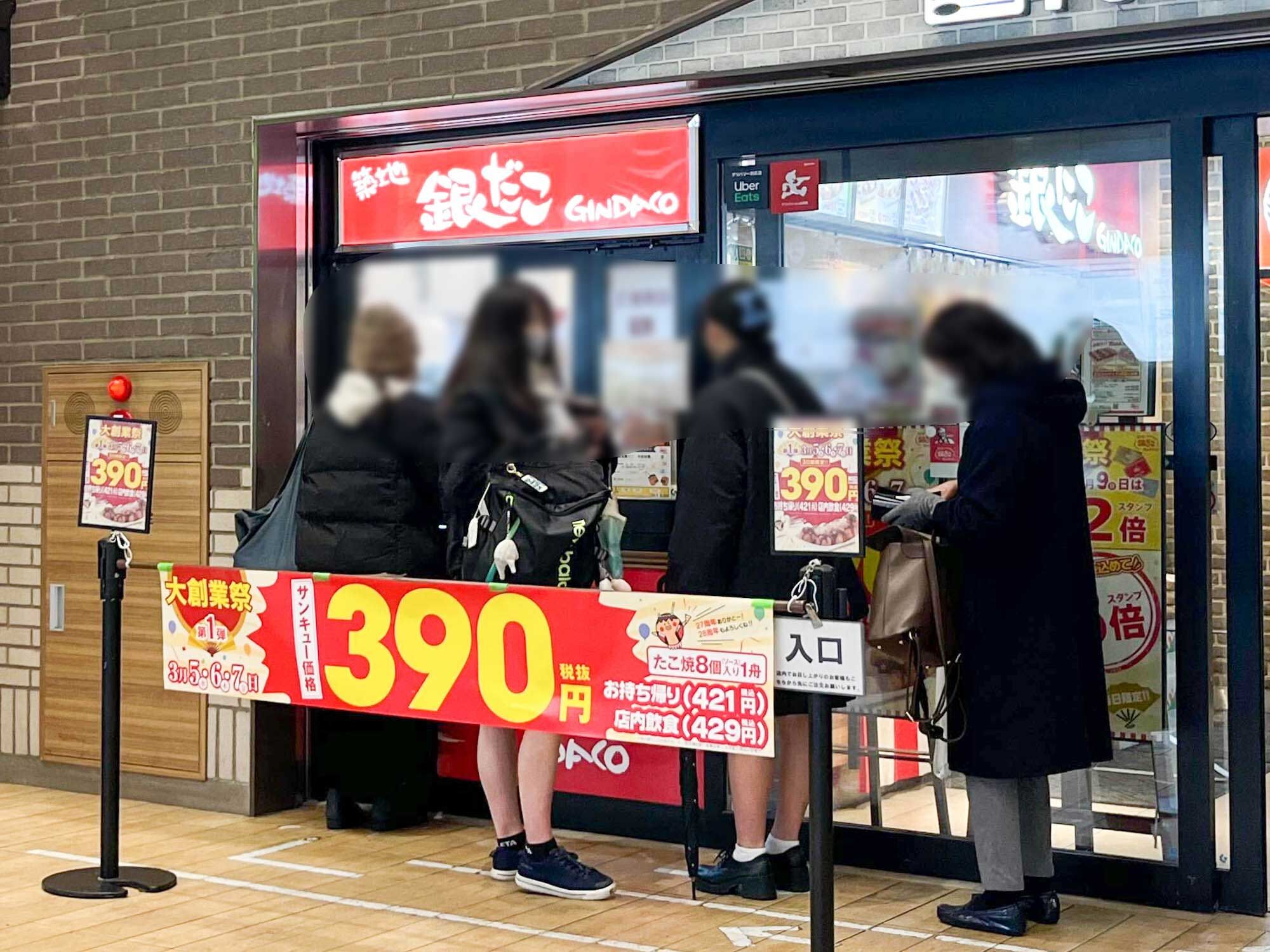 中央林間駅ナカの銀だこに行列ができてる。390円セール中。3月7日まで