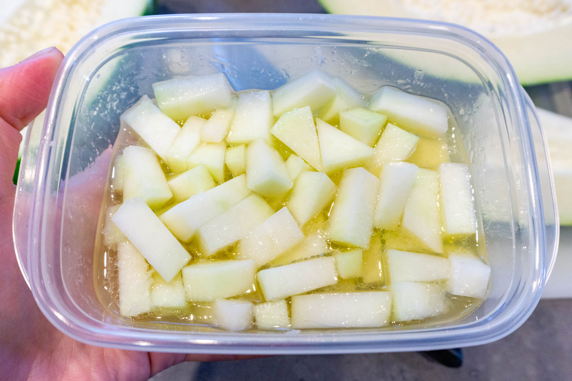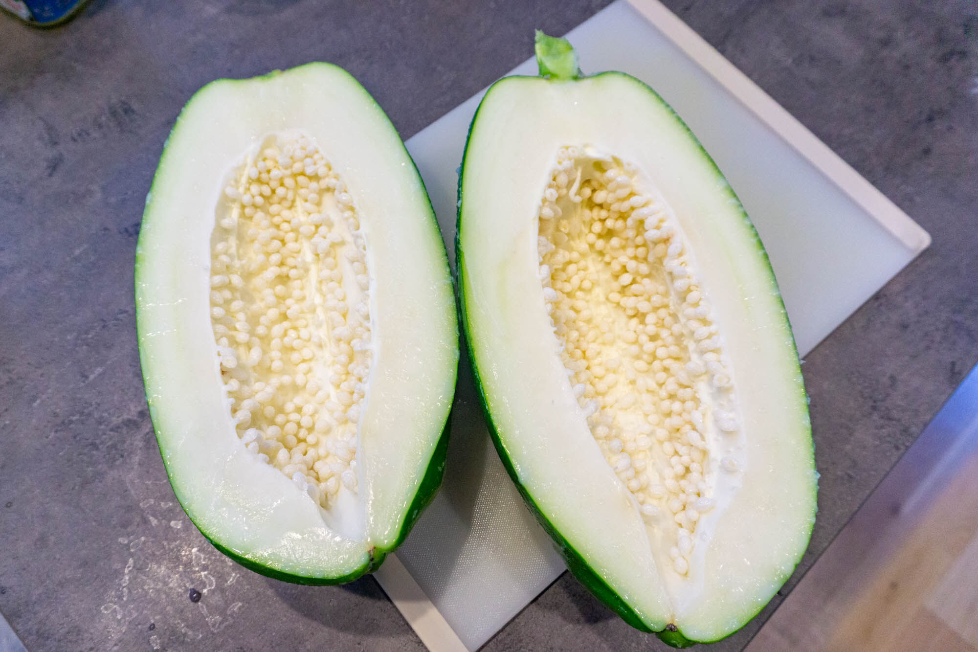 切った感じは固めのメロンを切っているような感触。切りにくい部分もありましたが、苦戦するようなこともなくいけました。周りの緑の皮はピーラーで剥けちゃいます。