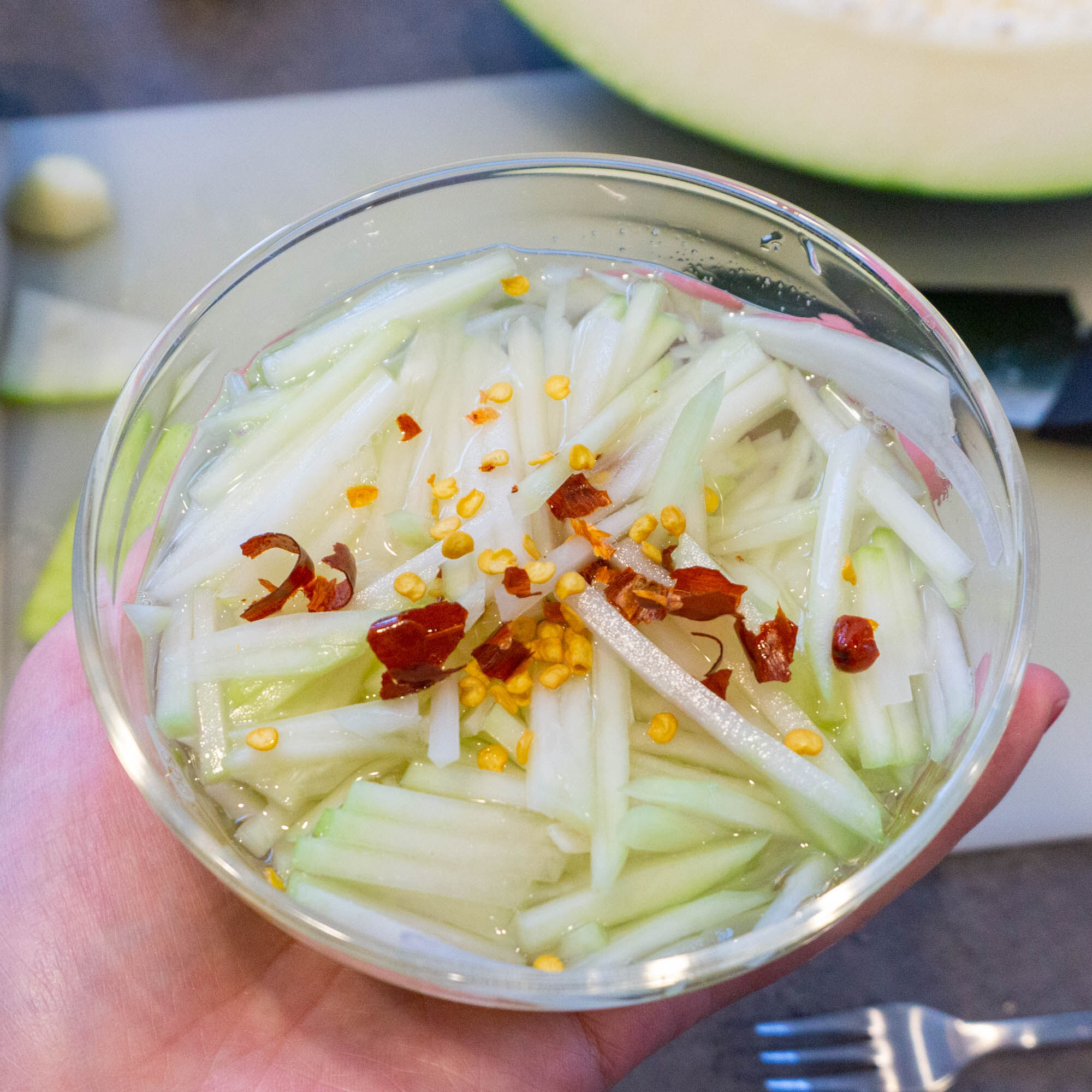 これはカンタン酢に鷹の爪を入れただけ!ピリ辛のお漬物が半日で完成。