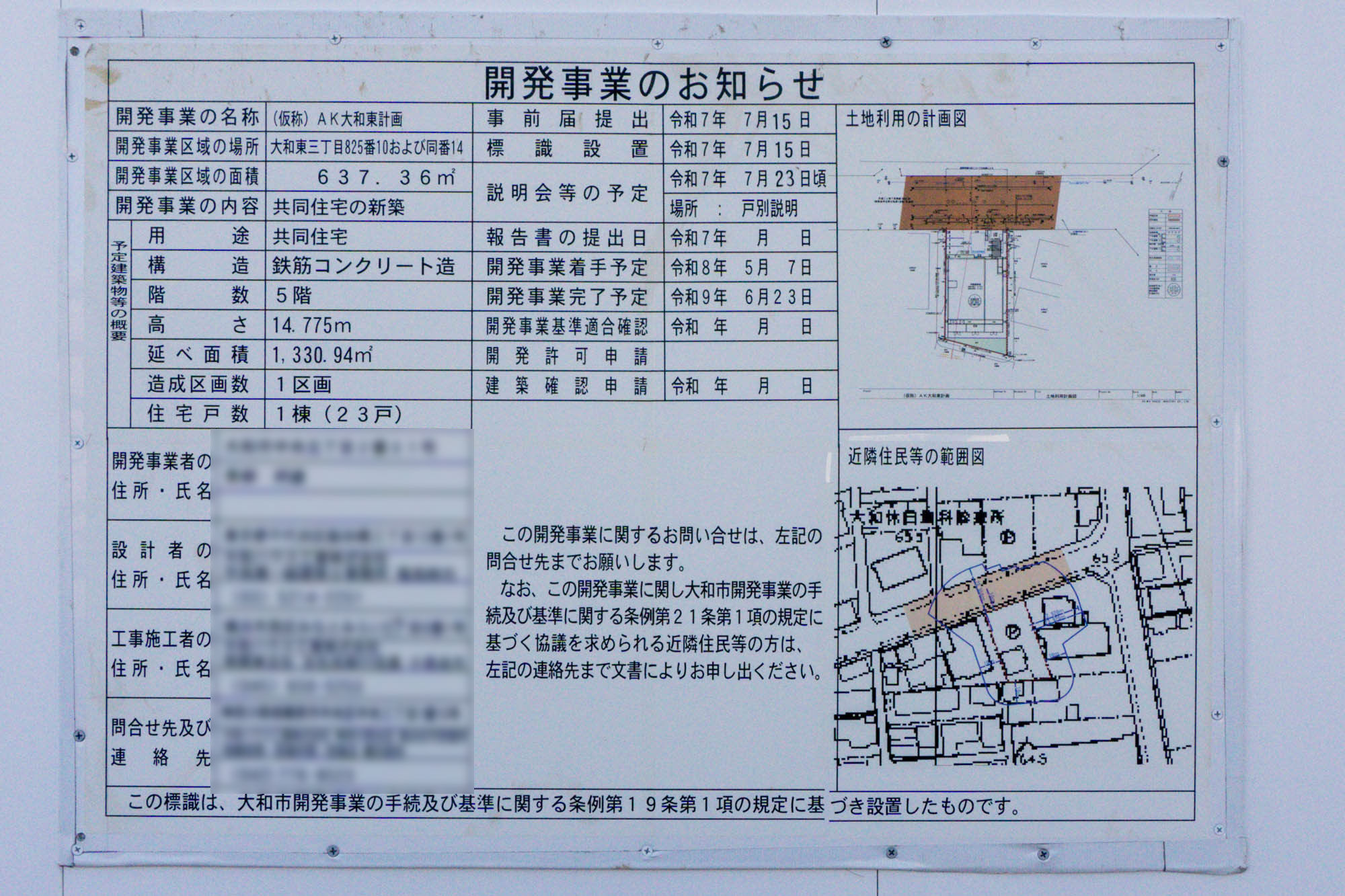 現地の工事板によると、2026年5月7日に開発事業着手予定で、2027年6月23日に開発事業完了予定のよう。5階建て23戸の共同住宅とのこと。