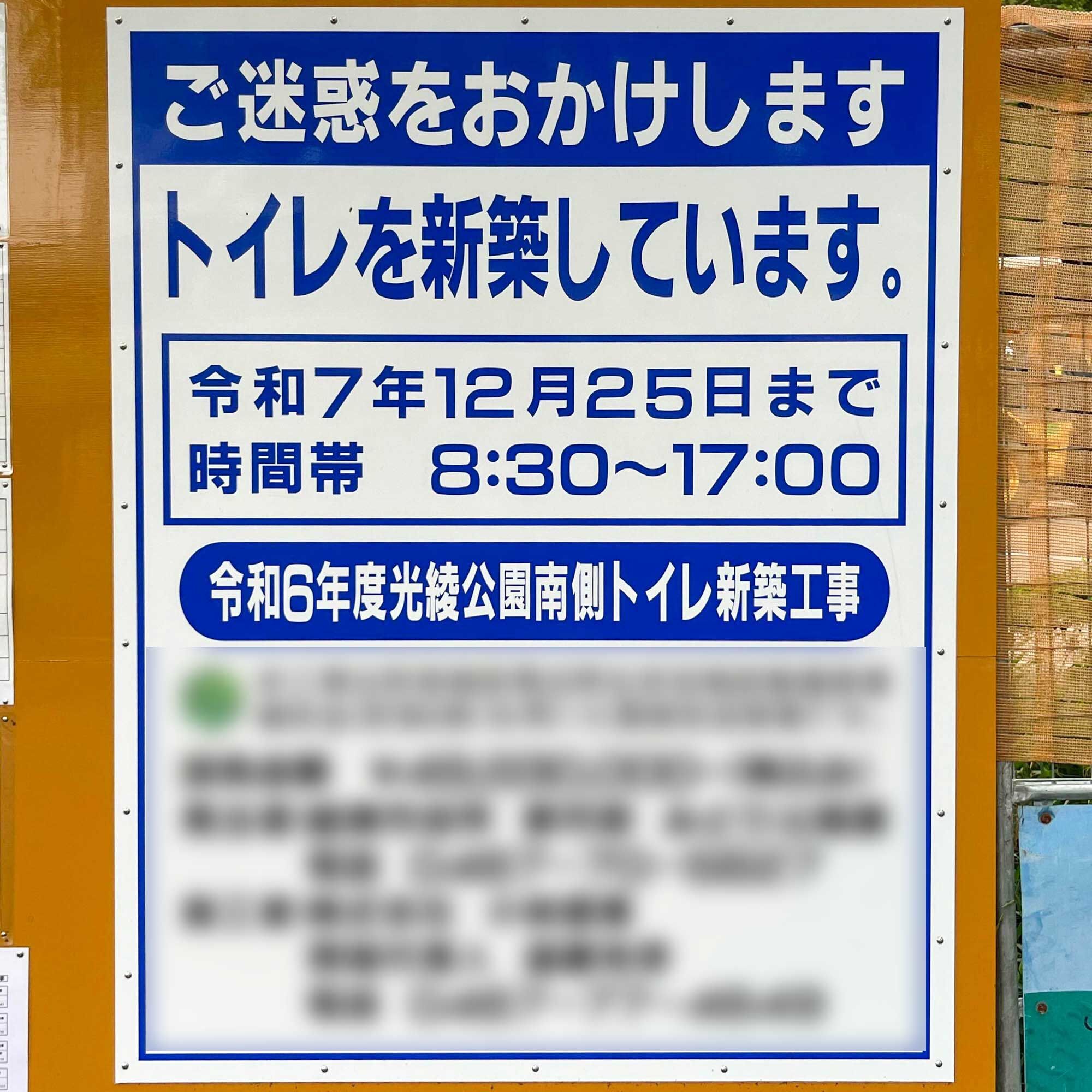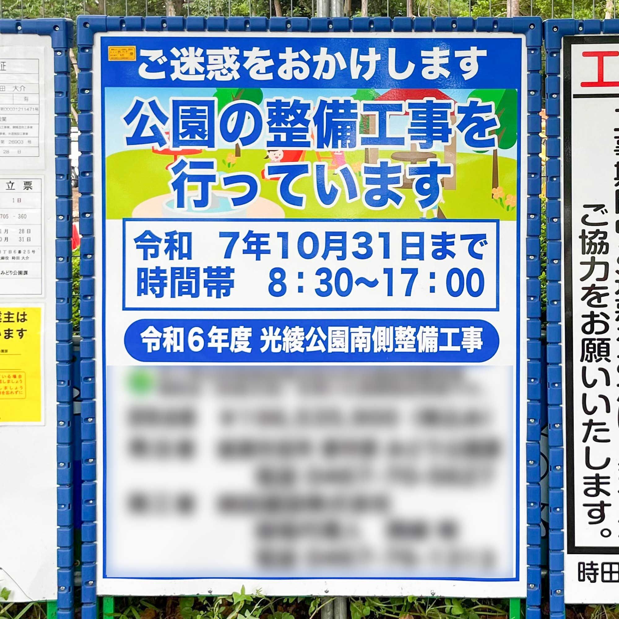 上記によると、光陵公園の南側エリア(遊具エリア)は、2025年度末にリニューアルオープン予定とのこと。現地を見に行きましたが、現時点ではまだ工事中でした。
