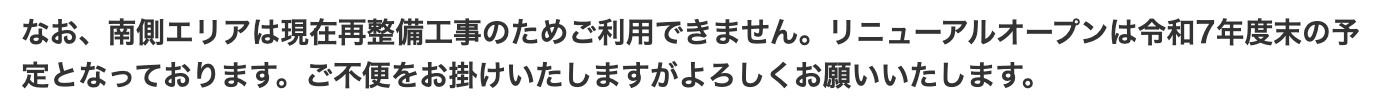 上記によると、南側エリアは〜2025年度秋以降に供用開始予定とのこと。すでに北側エリアは共用開始しており、管理棟やローズガーデンなども開放されています。