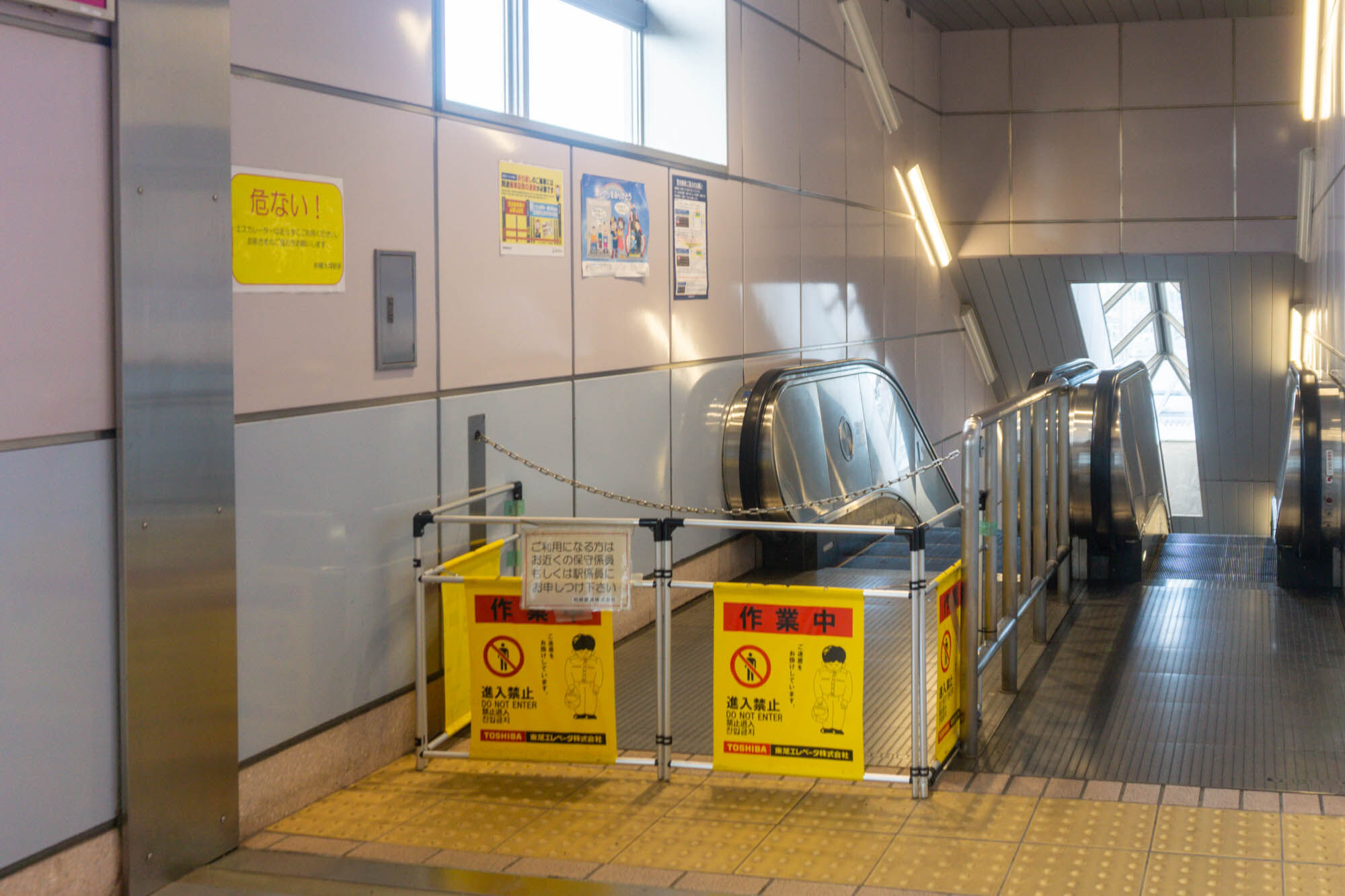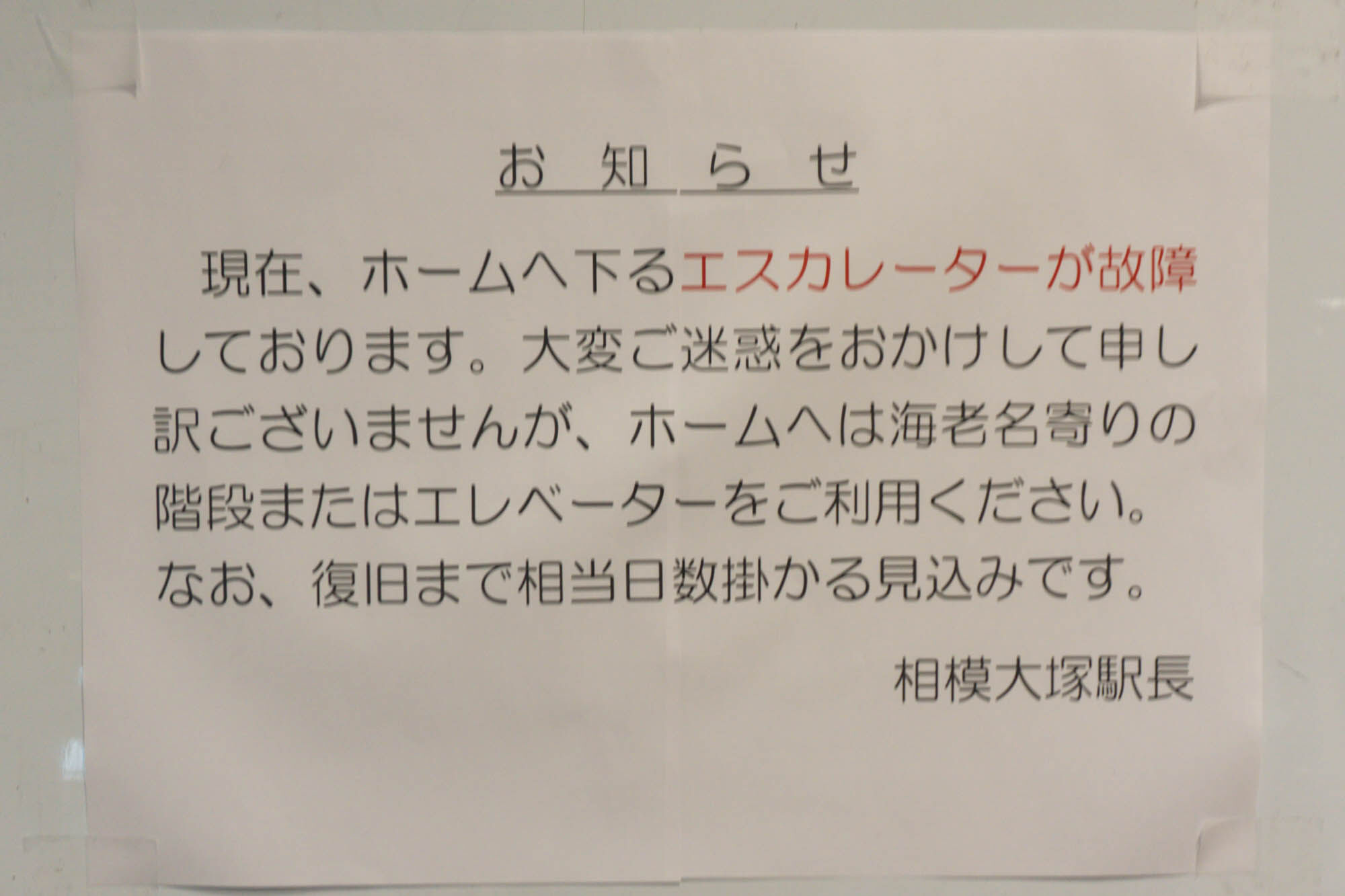 改札内にあった貼紙によると、下りエスカレーターが故障しており、階段またはエレベーターを利用するようにとのこと。復旧には相当日数掛かる見込みみたい。