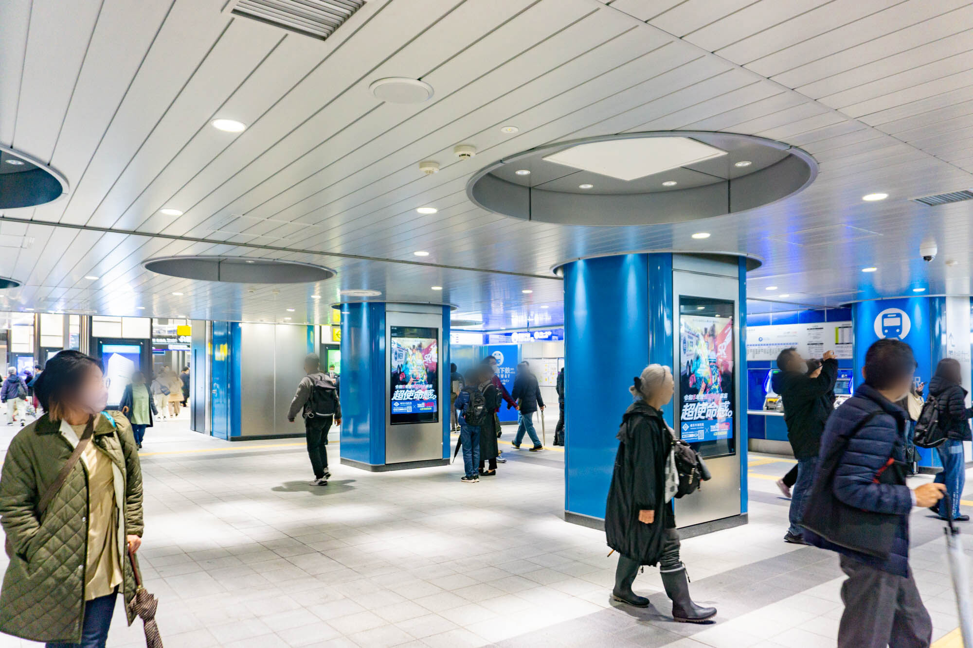 柱もブルー!ここも地下駅のため、エスカレーターを上がり改札口へ向かいます。