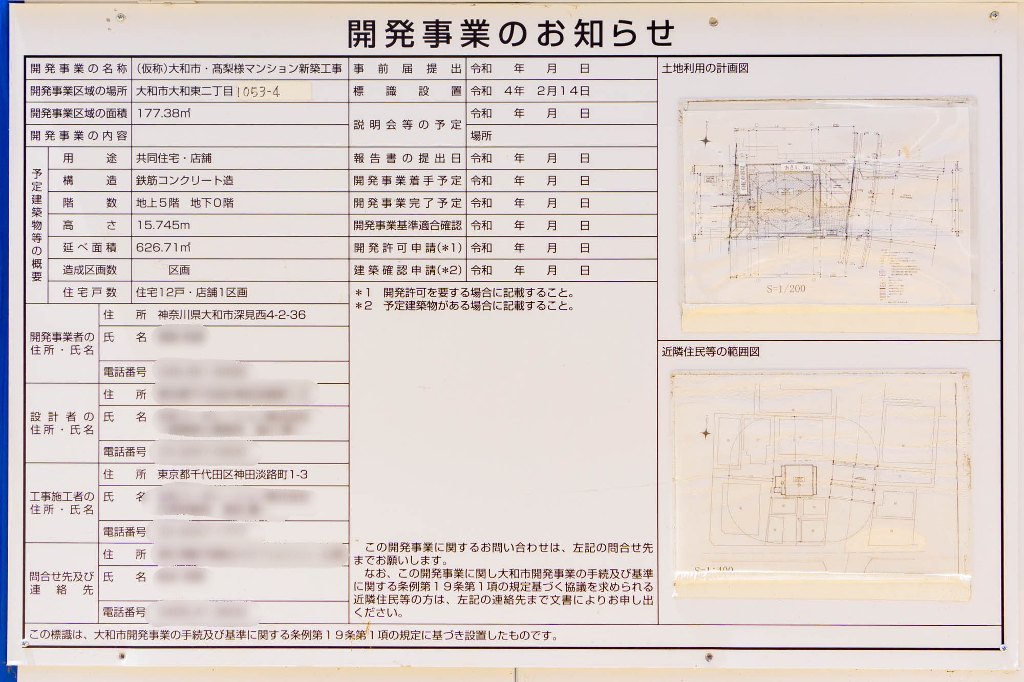 現地にあった看板によると、ここには5階建ての住居12戸、店舗が1つ入ったマンションができるみたい。